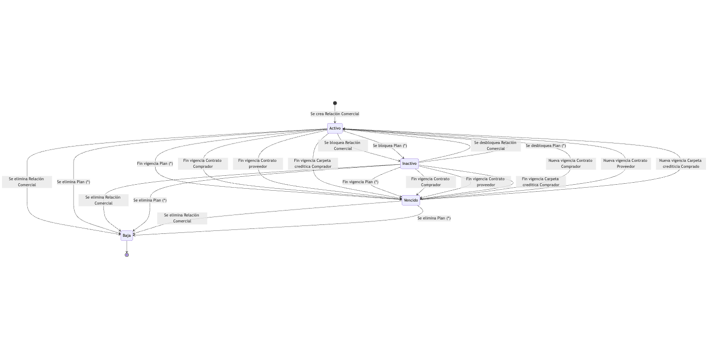 Este flujo maneja el ciclo de vida de una relación comercial dentro del sistema. Una relación puede pasar por los siguientes estados: