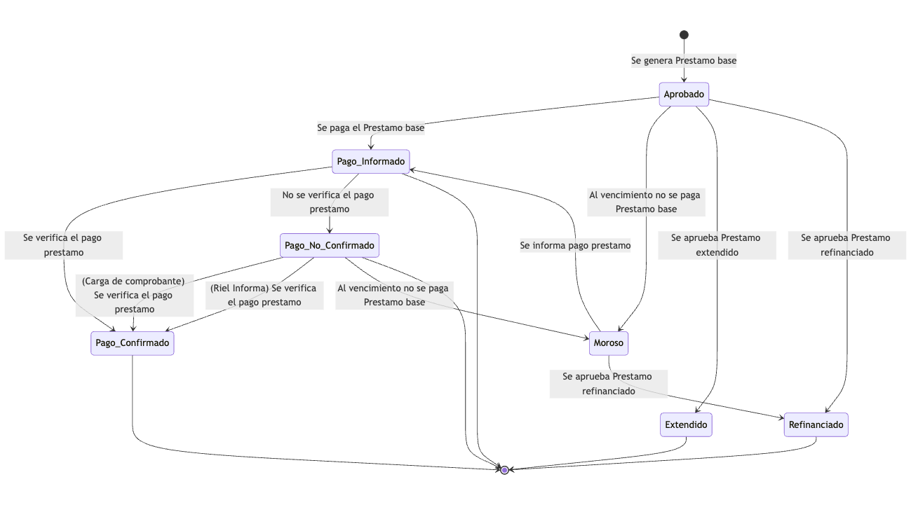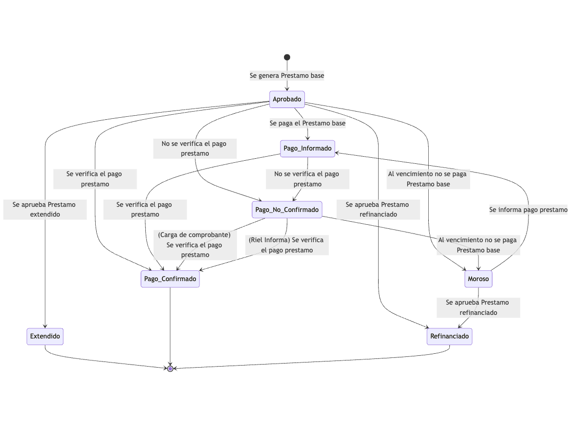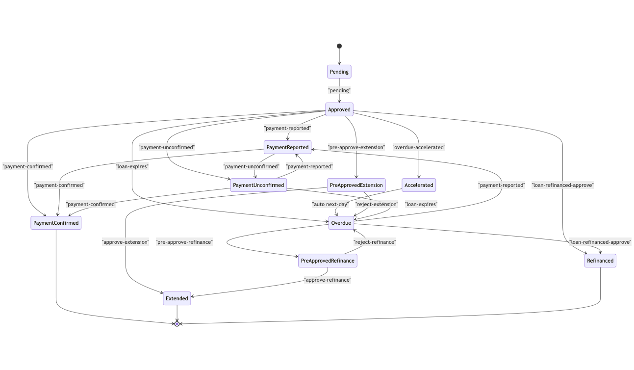 Esta máquina de estados gestiona el ciclo de vida de un préstamo desde su estado Pending hasta su liquidación o refinanciamiento. Incluye opciones para aprobación, pagos, vencimientos y extensiones.