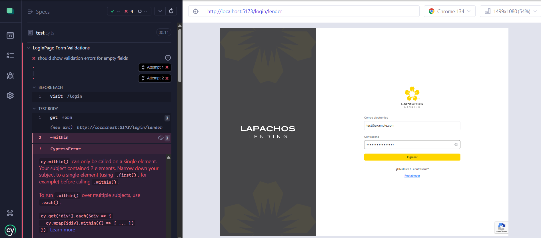 describe('Login Page Tests', () => { beforeEach(() => { cy.visit('/login'); }); it('should login successfully with correct credentials', () => { cy.get('input[name="email"]').type('validemail@example.com'); cy.get('input[name="password"]').type('validpassword'); cy.get('form').submit(); cy.url().should('include', '/lender/Home'); }); it('should show error message with incorrect credentials', () => { cy.get('input[name="email"]').type('invalidemail@example.com'); cy.get('input[name="password"]').type('invalidpassword'); cy.get('form').submit(); cy.get('[data-cy="error-message"]').should('be.visible'); }); it('should show error message when email is missing', () => { cy.get('input[name="password"]').type('validpassword'); cy.get('form').submit(); cy.get('[data-cy="error-message"]').should('be.visible'); }); it('should show error message when password is missing', () => { cy.get('input[name="email"]').type('validemail@example.com'); cy.get('form').submit(); cy.get('[data-cy="error-message"]').should('be.visible'); }); it('should show MFA code modal when MFA is required', () => { cy.intercept('POST', '/api/authenticate', { statusCode: 200, body: { nextStep: 'CONFIRM_SIGN_IN_WITH_TOTP_CODE' }, }).as('authenticate'); cy.get('input[name="email"]').type('mfaemail@example.com'); cy.get('input[name="password"]').type('mfapassword'); cy.get('form').submit(); cy.wait('@authenticate'); cy.get('[data-cy="mfa-modal"]').should('be.visible'); }); it('should redirect to new password page when new password is required', () => { cy.intercept('POST', '/api/authenticate', { statusCode: 200, body: { nextStep: 'CONFIRM_SIGN_IN_WITH_NEW_PASSWORD_REQUIRED' }, }).as('authenticate'); cy.get('input[name="email"]').type('newpasswordemail@example.com'); cy.get('input[name="password"]').type('newpassword'); cy.get('form').submit(); cy.wait('@authenticate'); cy.url().should('include', '/Activate-Account/lender'); }); });Resultado: Inicialmente no es el resultado esperado, el código requiere personalizar algunos componentes y agregar la data de prueba para cada caso.