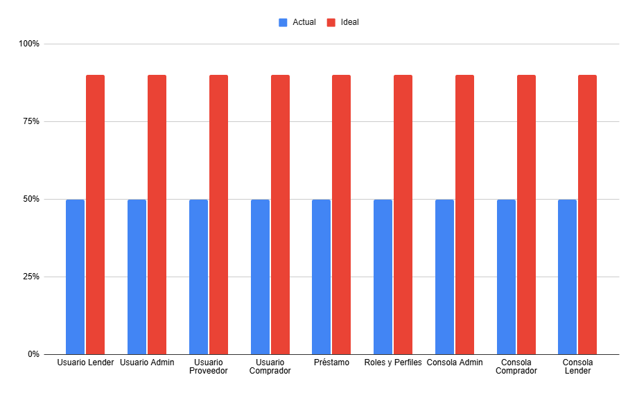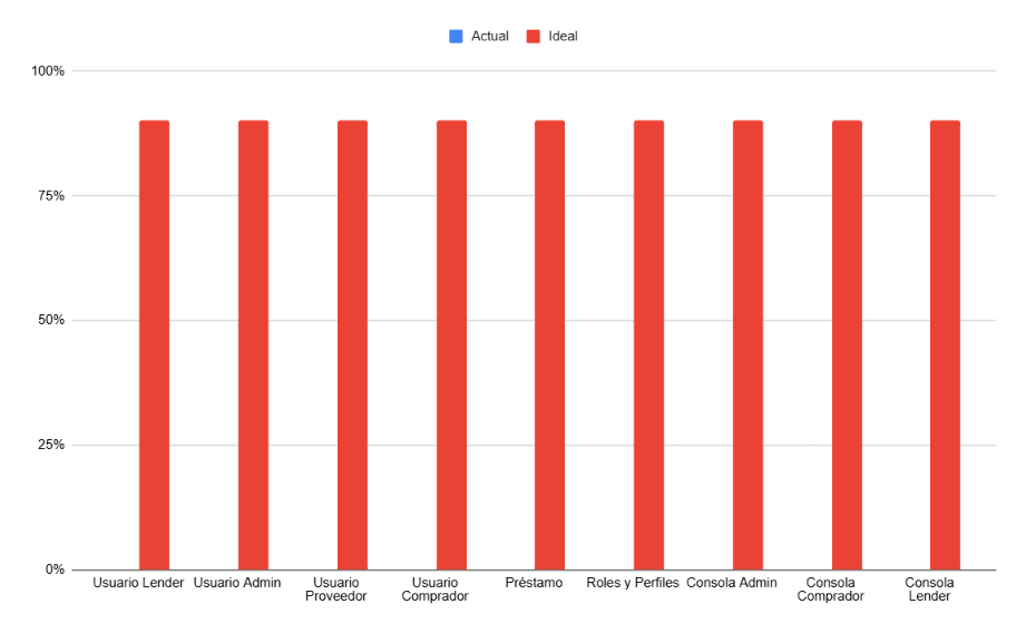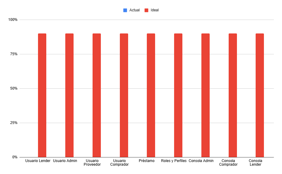 La cobertura actual está en 64% solo en el frontend, con gaps significativos en backend y módulos complejos del frontend. Para alcanzar el 90% ideal, se requiere enfocarse en revisión de test actuales, automatizar flujos E2E, actualizar pruebas unitarias en el frontend e iniciar con el desarrollo de pruebas en el backend.