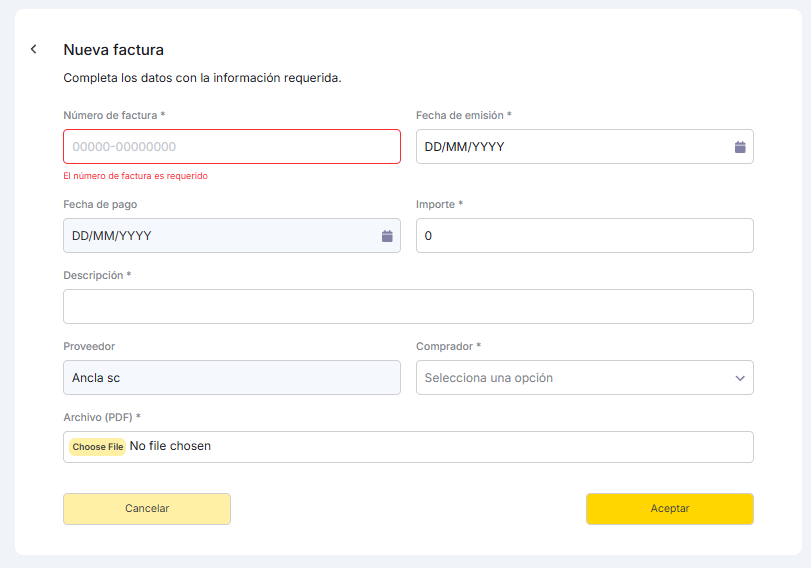 Desde su consola, el Proveedor accede a la sección de "Facturas" y selecciona la opción para crear una nueva. El formulario de alta requiere los siguientes campos: