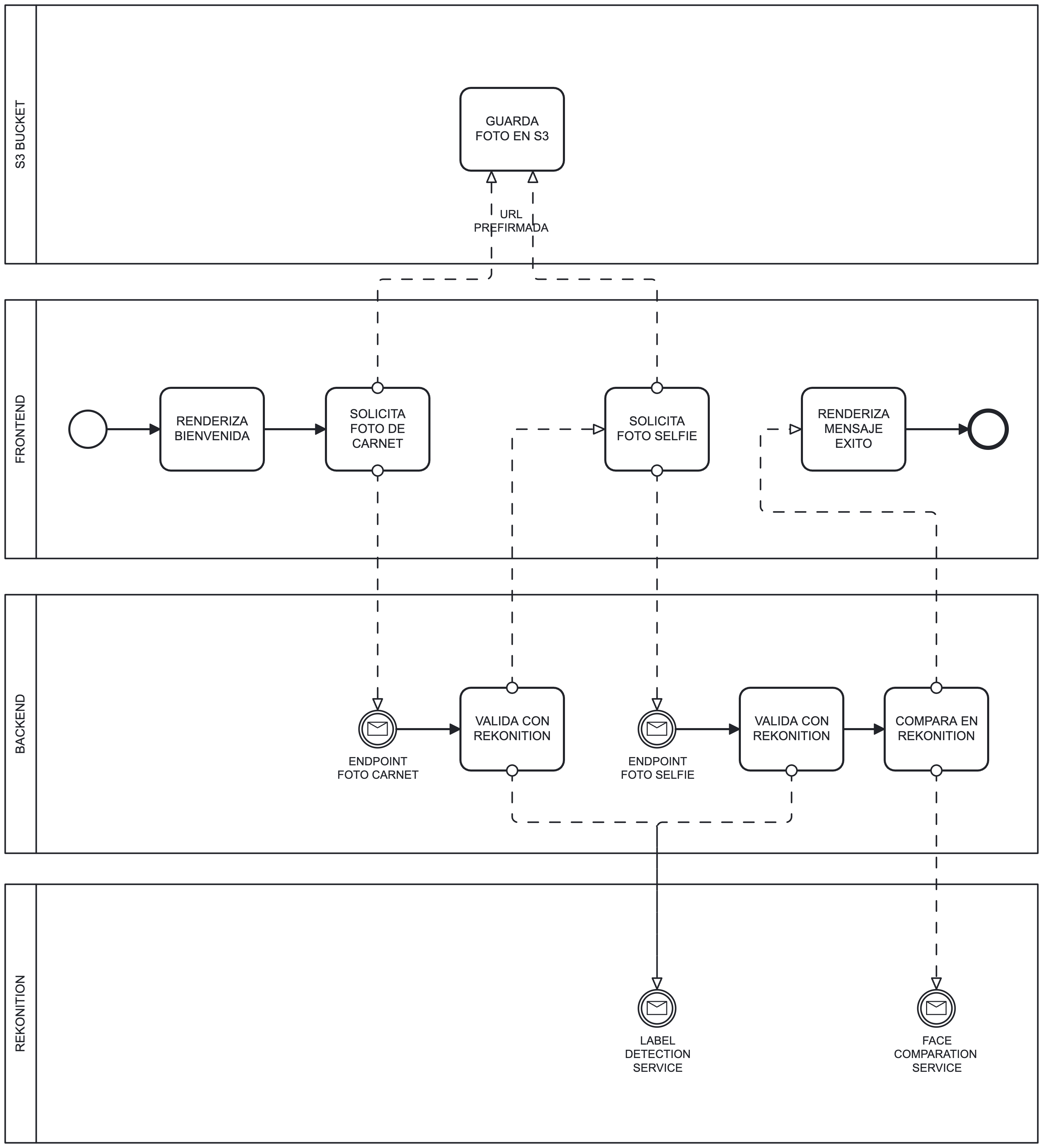 Motor biométrico | AWS Rekognition | Analiza, valida y compara las imágenes. Incluye detección de rostros, validación de integridad y comparación facial. |