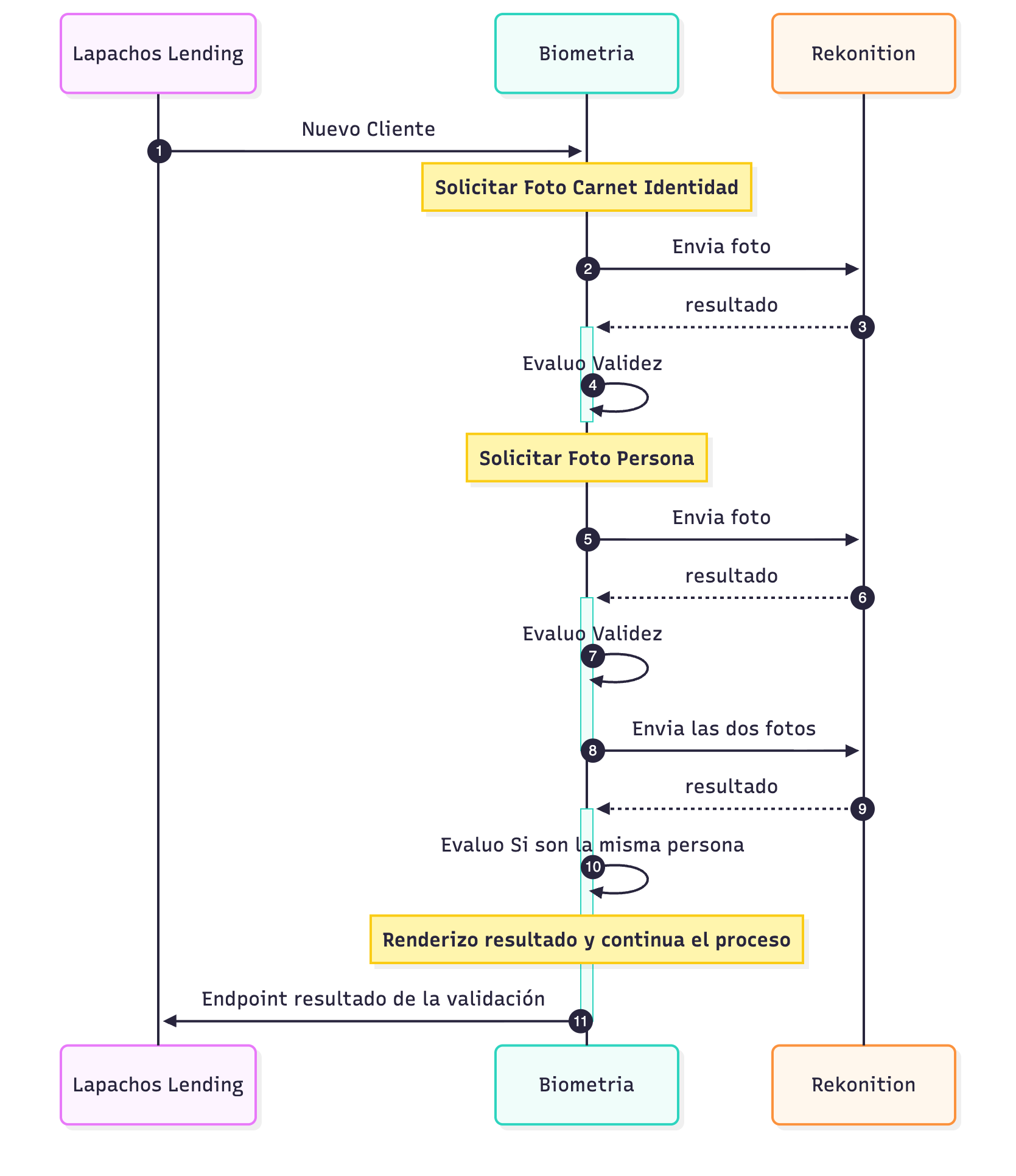 sequenceDiagram participant lapachos as Lapachos Lending participant biometria as Biometria participant rekonition as Rekonition autonumber lapachos ->> biometria: Nuevo Cliente Note over biometria: Solicitar Foto Carnet Identidad biometria ->> rekonition: Envia foto rekonition -->>+ biometria: resultado biometria ->>- biometria: Evaluo Validez Note over biometria: Solicitar Foto Persona biometria ->> rekonition: Envia foto rekonition -->>+ biometria: resultado biometria ->> biometria: Evaluo Validez biometria ->>- rekonition: Envia las dos fotos rekonition -->>+ biometria: resultado biometria ->> biometria: Evaluo Si son la misma persona Note over biometria: Renderizo resultado y continua el proceso biometria ->>- lapachos: Endpoint resultado de la validación
