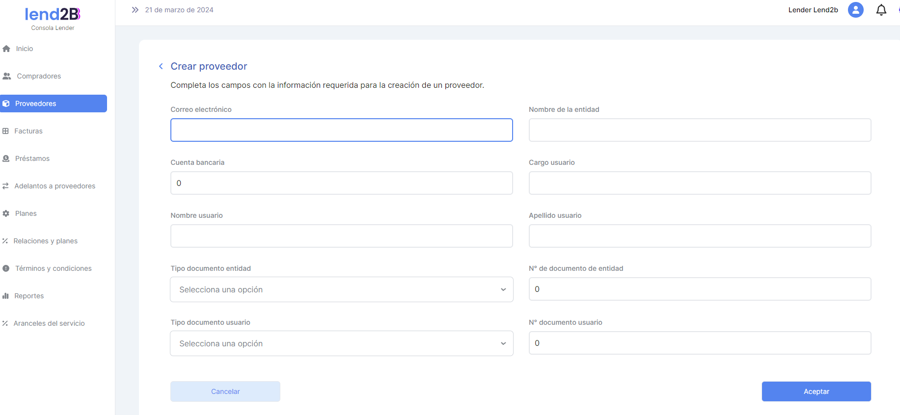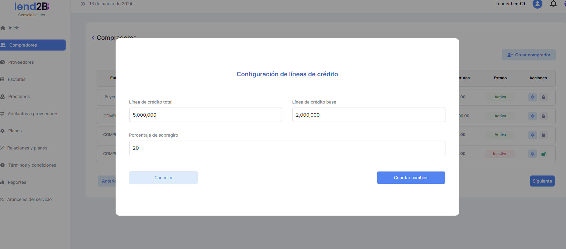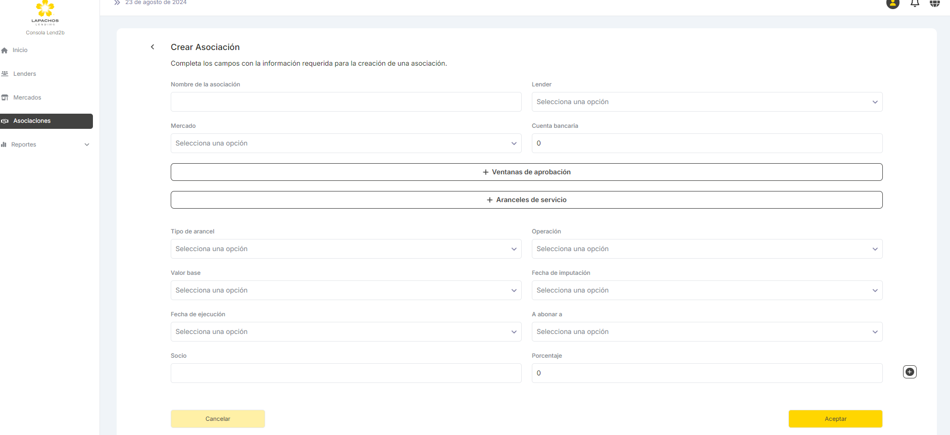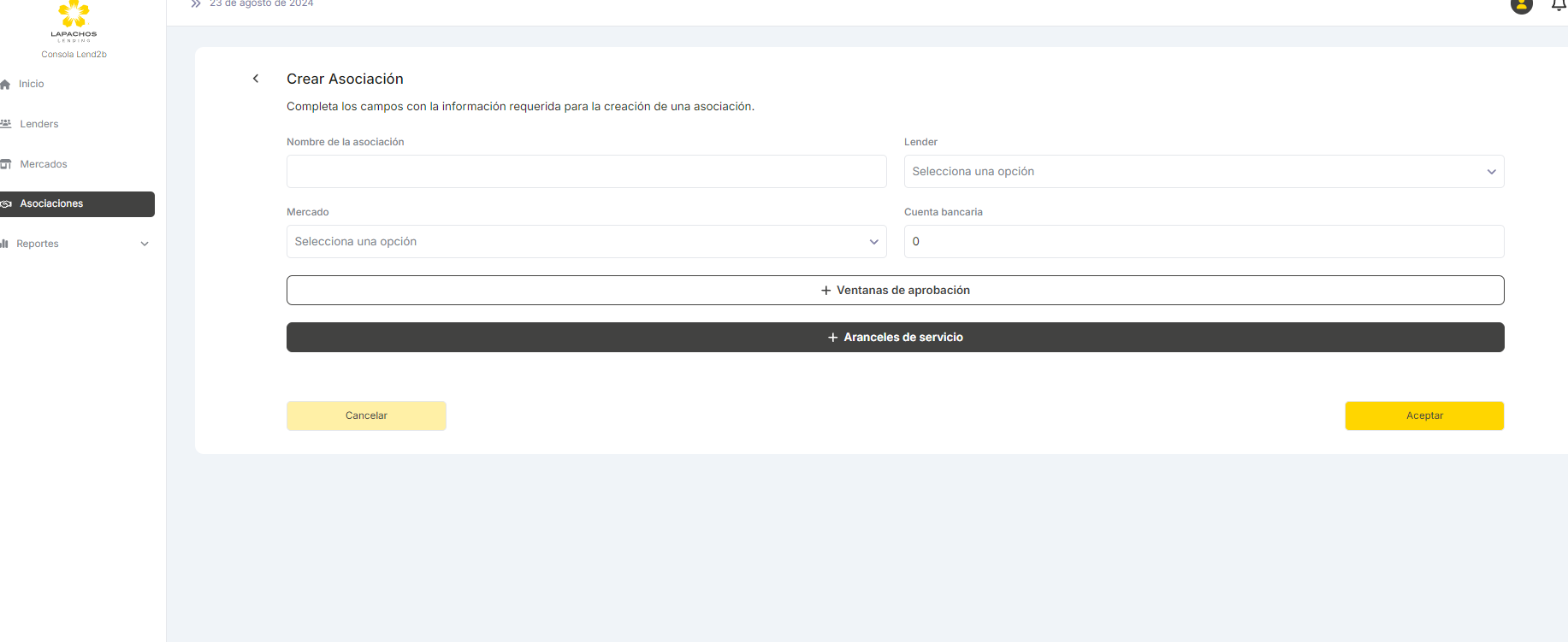 En la secion de Asociaciones del Menú se generarán las relaciones entre un Lender y un Mercado definiendo los parámetros acordados para esa asociación.
