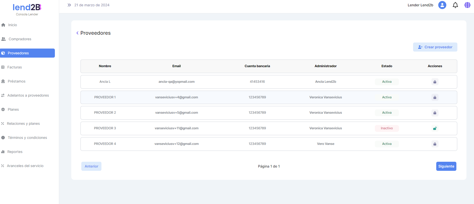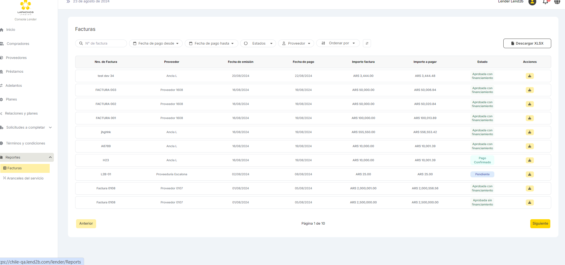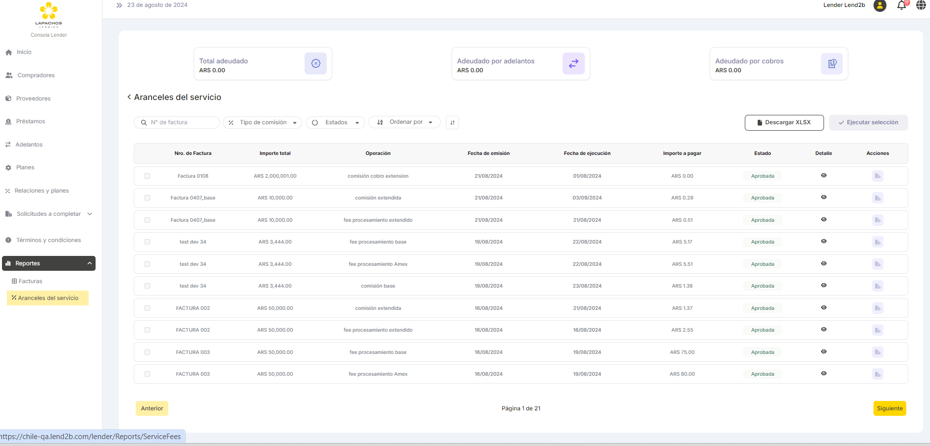 Una vez que el Lender selecciona que reporte quiere ver debe acceder al detalle actual tanto de Facturas como de Aranceles del Servicio