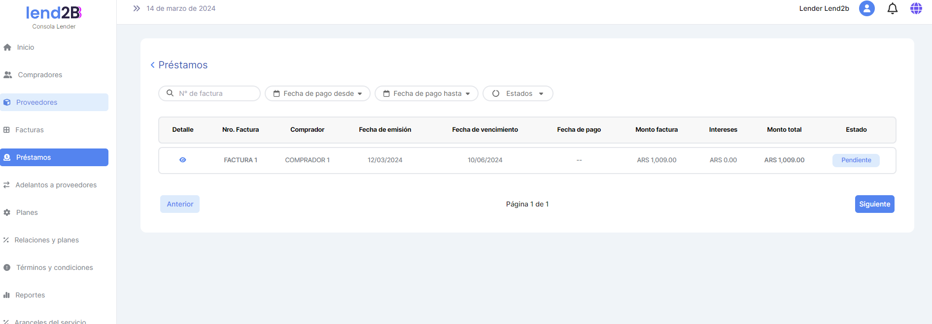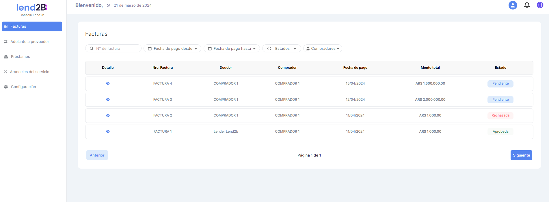 La visualización de estas dos pantallas se mantiene permitiendo ver al Lender una Factura o Arancel en particular accediendo a Detalle.