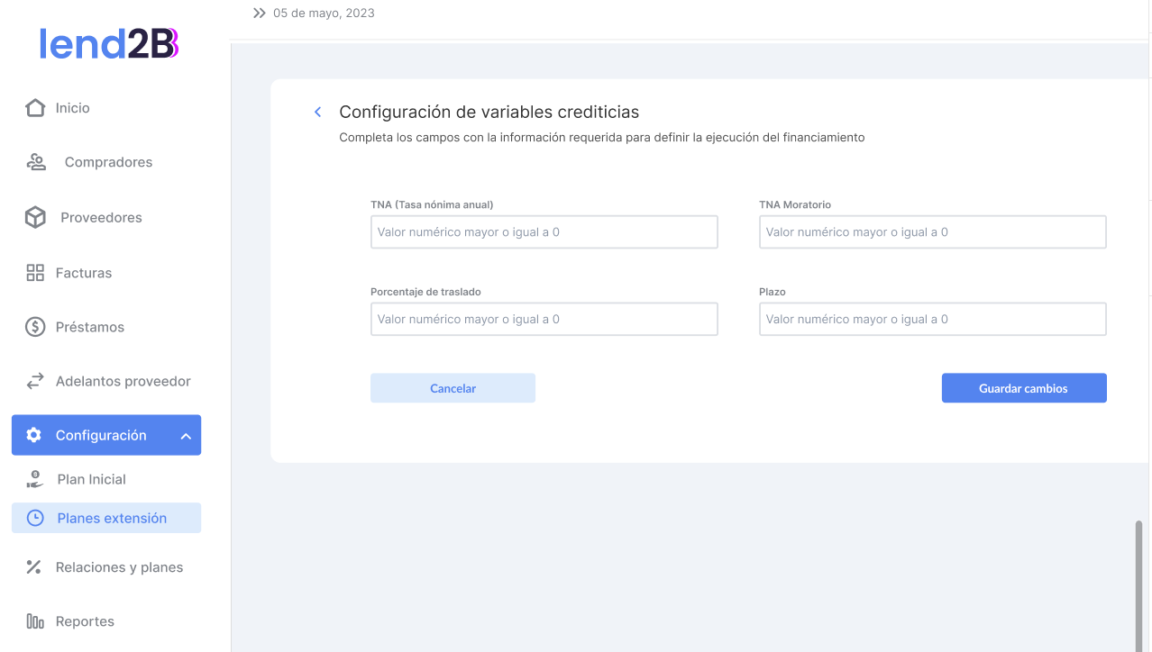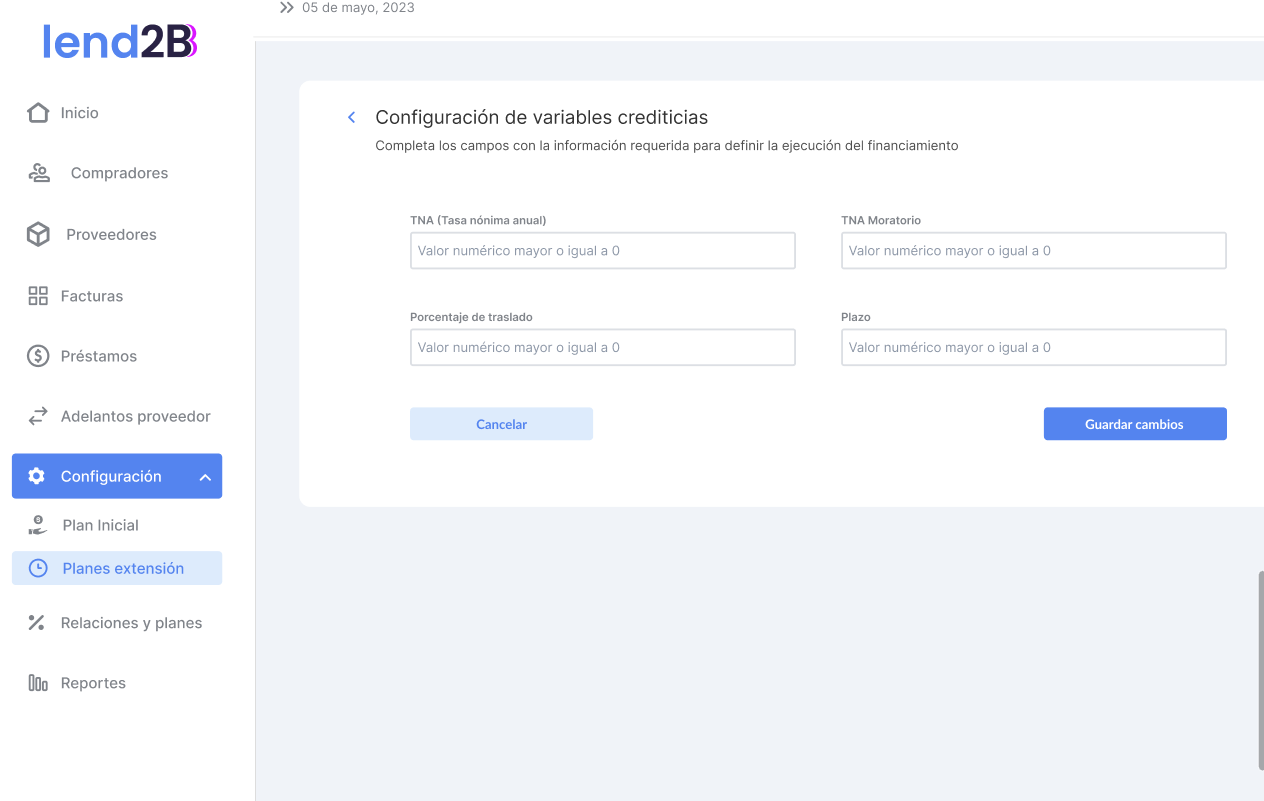 El Fee Base deberá ser abonado por el Lender a los XX días resultantes de Fecha de emisión de la factura + dias del Periodo Inicial (en la configuración del plan base). En la configuración actual es a los 30 días de emitida la factura.