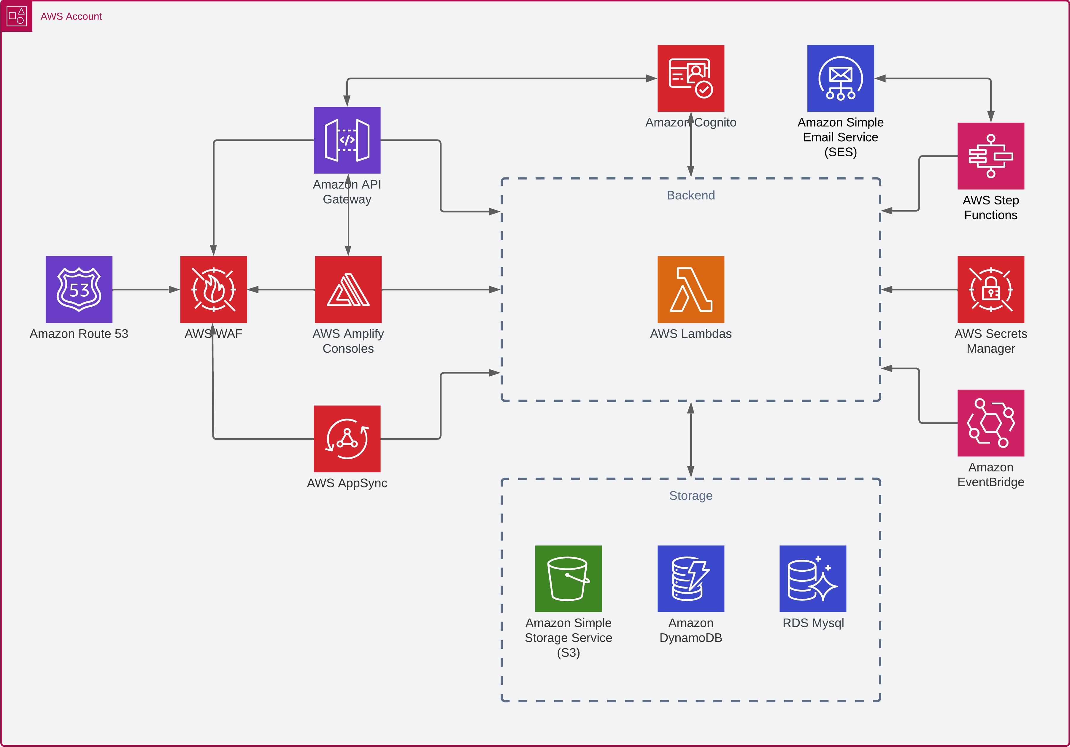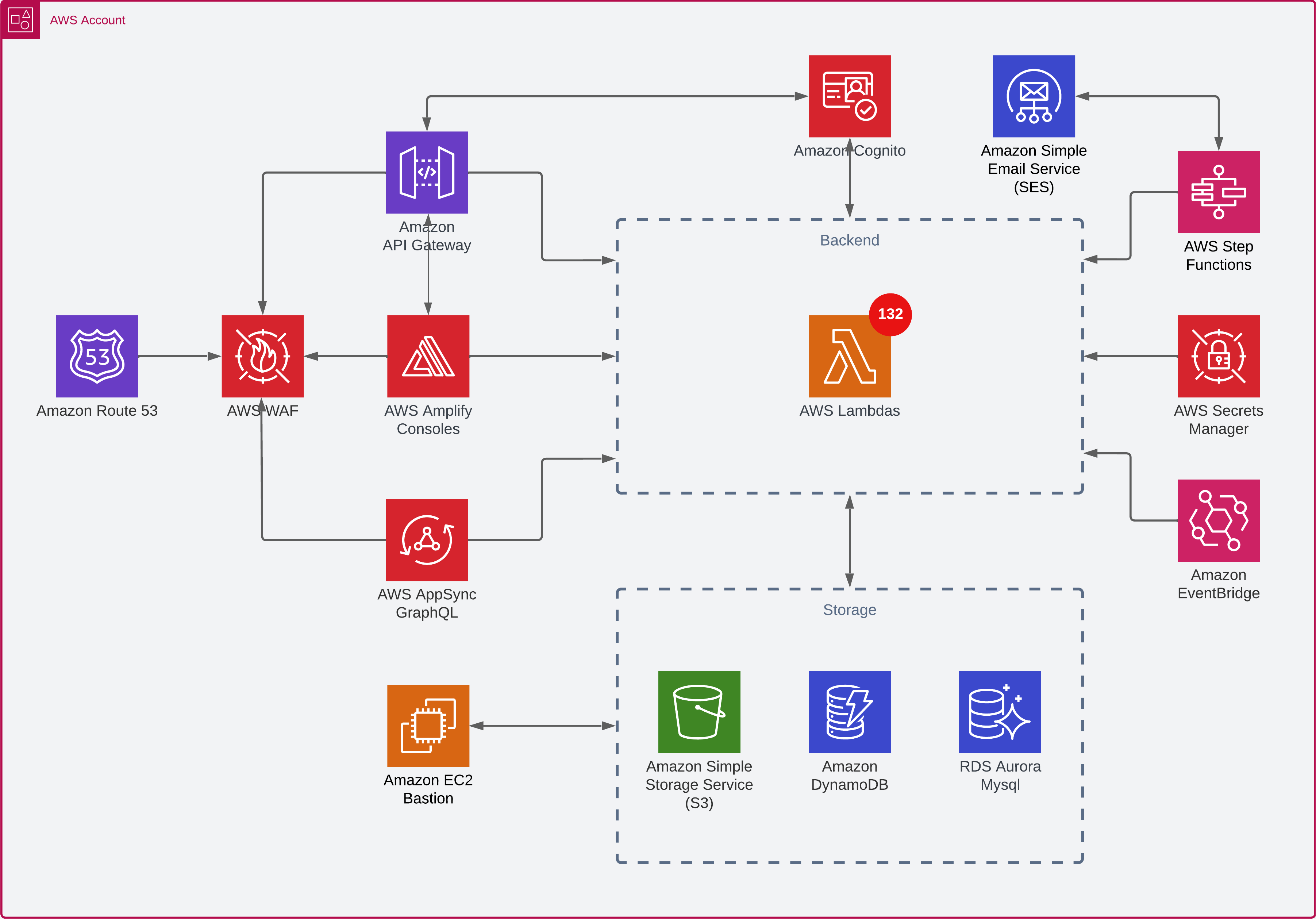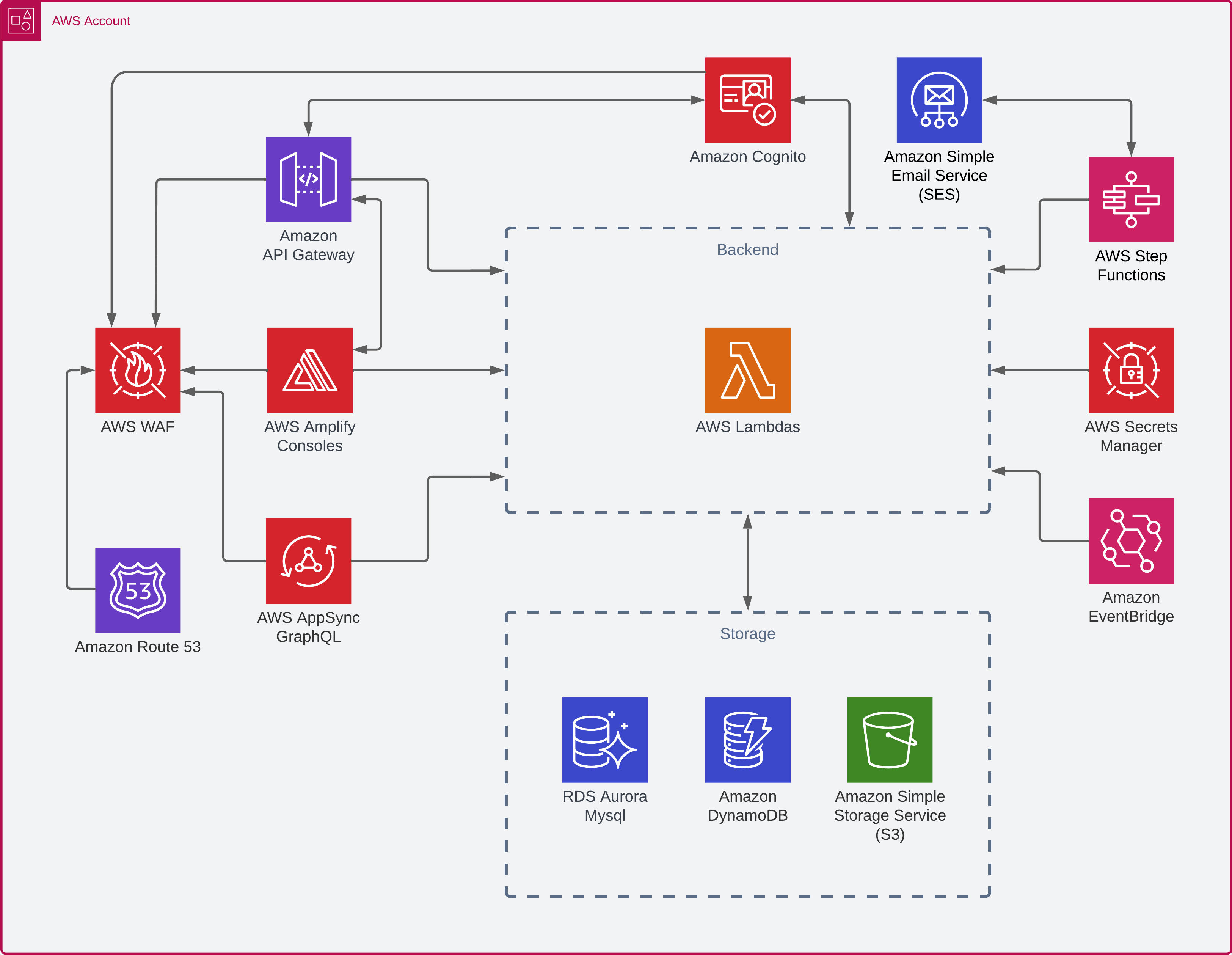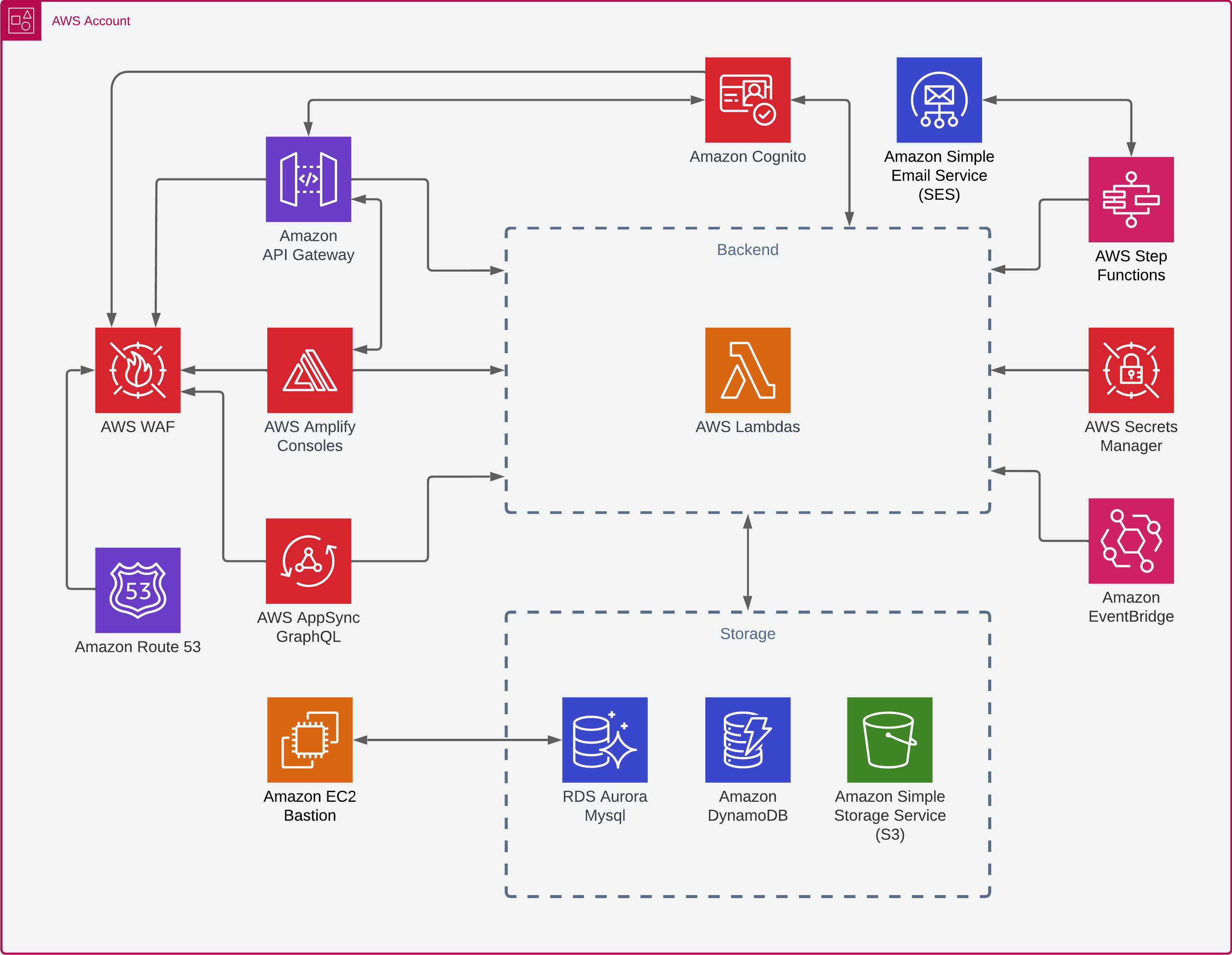 Este diagrama de arquitectura ilustra la infraestructura en AWS para un sistema basado en servicios serverless y recursos gestionados.