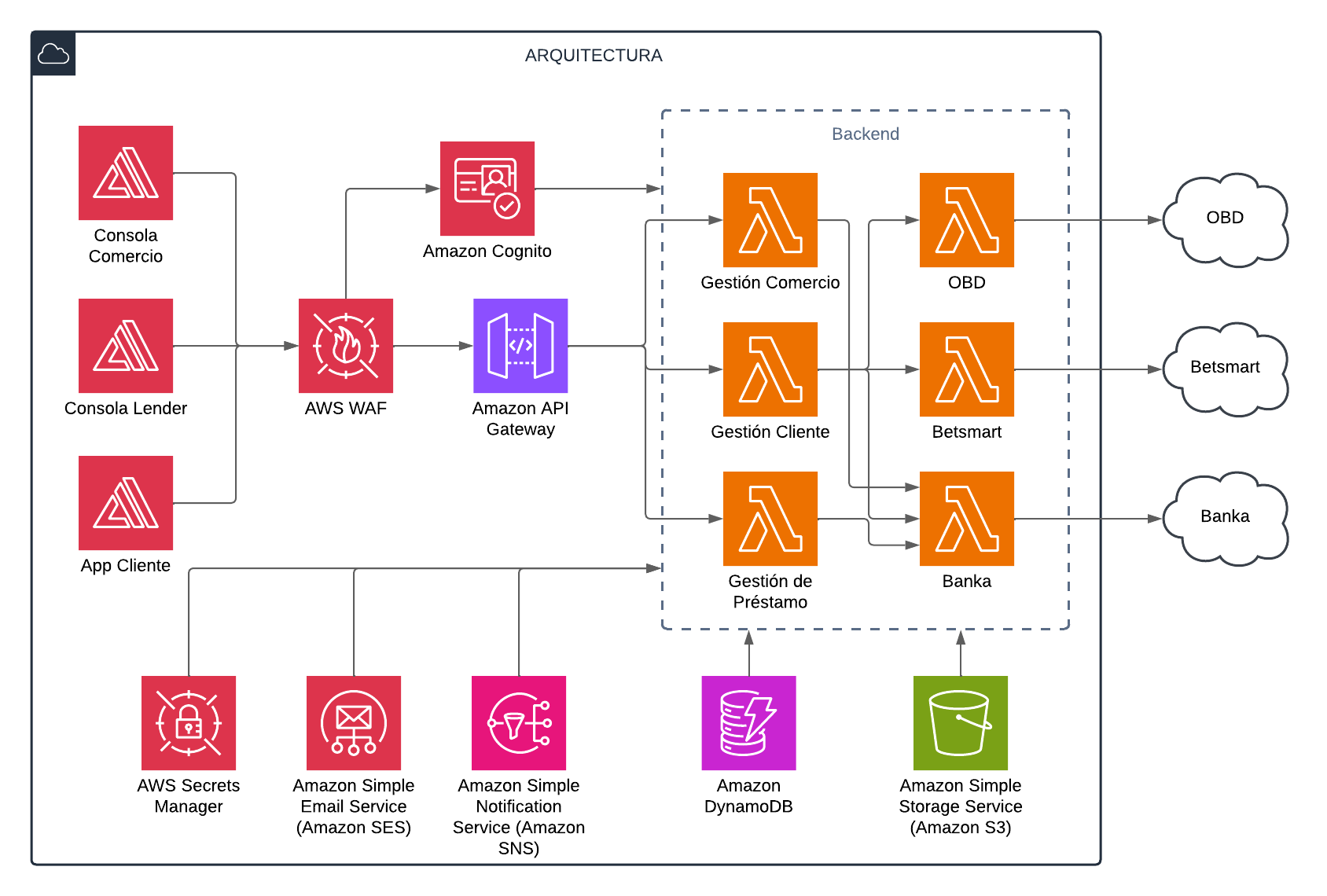 La arquitectura propuesta está diseñada bajo un enfoque serverless en AWS, orientada a proveer servicios de lending y gestión de clientes, comercios y préstamos con alta seguridad, escalabilidad y disponibilidad.
