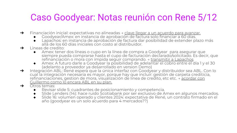 Integración ABL | Integración ABL: René espera que la única interfaz con Goodyear y distribuidor sea ABL. Con lo cual la integración necesaria es mayor, porque hay que incluir: gestión de carpeta crediticia, refinanciaciones, gestión de mora, visualización de línea de crédito, etc etc. Esto se charlo con Guille y volvió el boomerang después de Rene, Santiago Gaviglio lo va a comentar con Guille. | ||