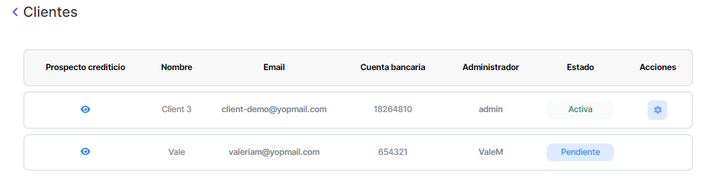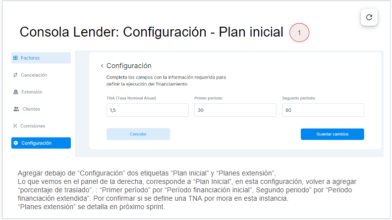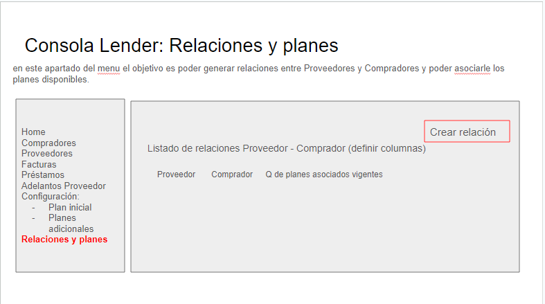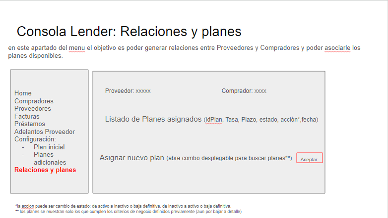 La propuesta inicial es la siguiente, tomada del ppt de definicion “consola Lender” (https://docs.google.com/presentation/d/1-S11YwMZgEXczp_sMefrF-lhE_JOl9DPd6F8Ha4wOXE/edit#slide=id.g1ef6bb89343_1_158 ):