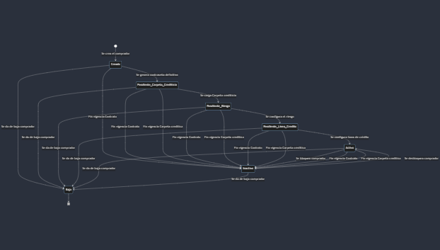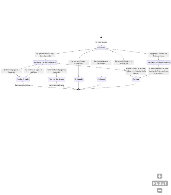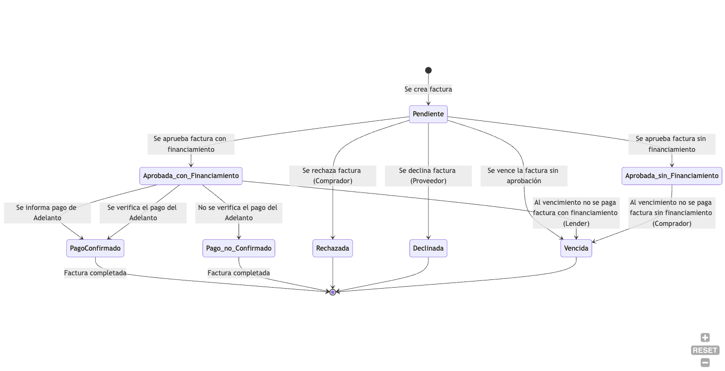 Este flujo modela el ciclo de vida de una factura en el sistema, desde su creación hasta su pago, rechazo o expiración.