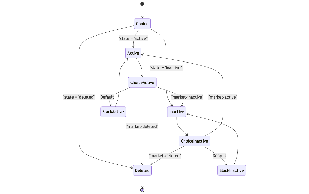 Este flujo maneja el ciclo de vida de un mercado dentro del sistema. Se inicia evaluando el estado del mercado y lo dirige a uno de los tres estados posibles: activo, inactivo o eliminado.