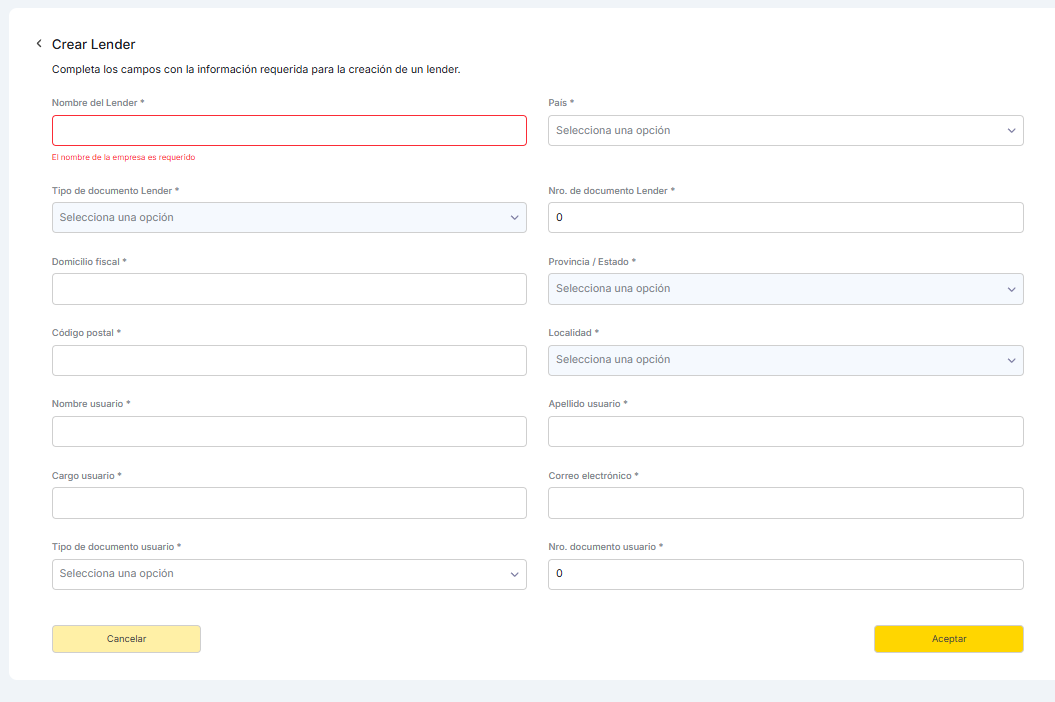 El primer paso es registrar al Lender como una entidad dentro de la plataforma. El administrador debe completar un formulario con la siguiente información, que incluye tanto los datos de la empresa como los del usuario principal que la representará: