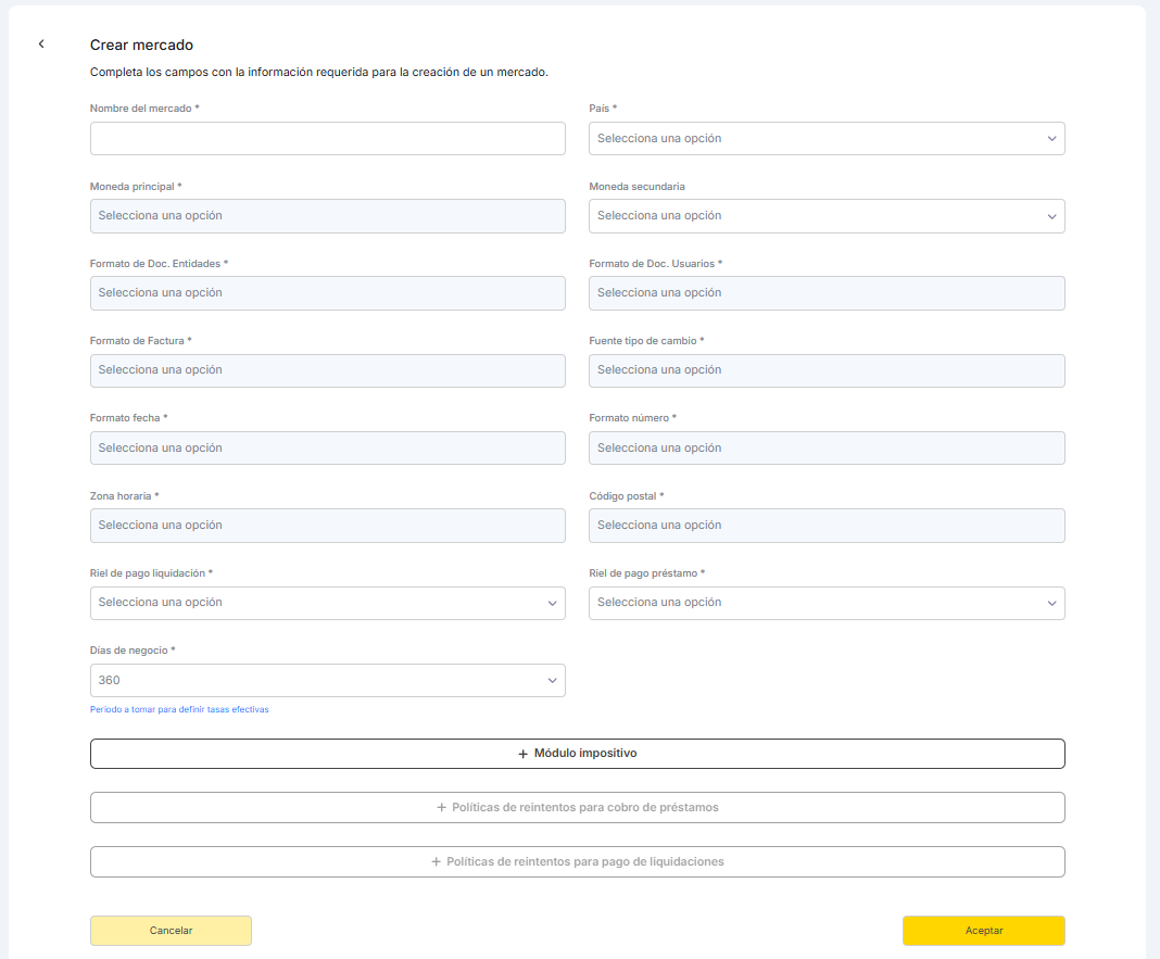 El mercado define el entorno operativo y las reglas financieras bajo las cuales operará el Lender. Al crear un nuevo mercado, se le solicita al administrador que ingrese la siguiente información: