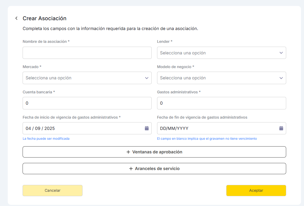 La asociación es el nexo que vincula al Lender con el Mercado que se acaba de crear, definiendo las condiciones comerciales y operativas para su relación. Los datos requeridos son: