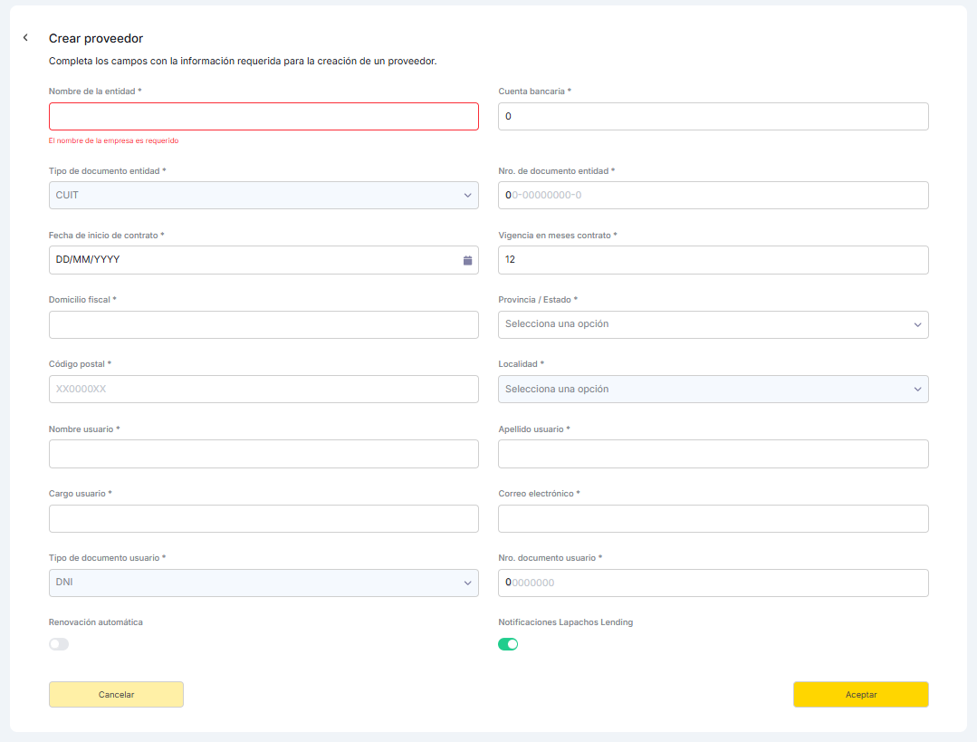 Desde su consola, el Lender accede a la sección de proveedores para crear una nueva entidad. Para ello, debe completar el formulario de alta con los siguientes datos: