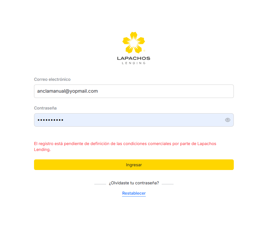 Si el proveedor intenta ingresar a su consola antes de este proceso, se le mostrara un mensaje de “El registro está pendiente de definición de las condiciones comerciales por parte de Lapachos Lending”.