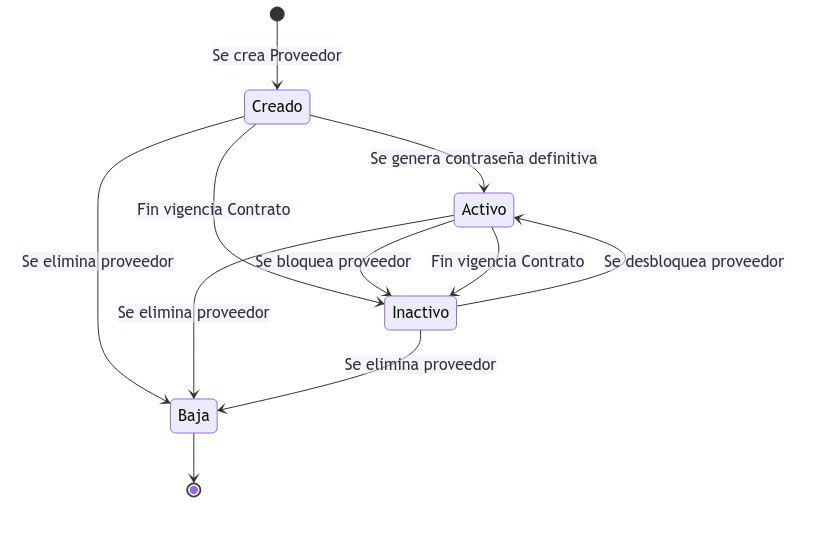 Este flujo maneja el ciclo de vida de un proveedor dentro del sistema, permitiendo transiciones entre los siguientes estados: