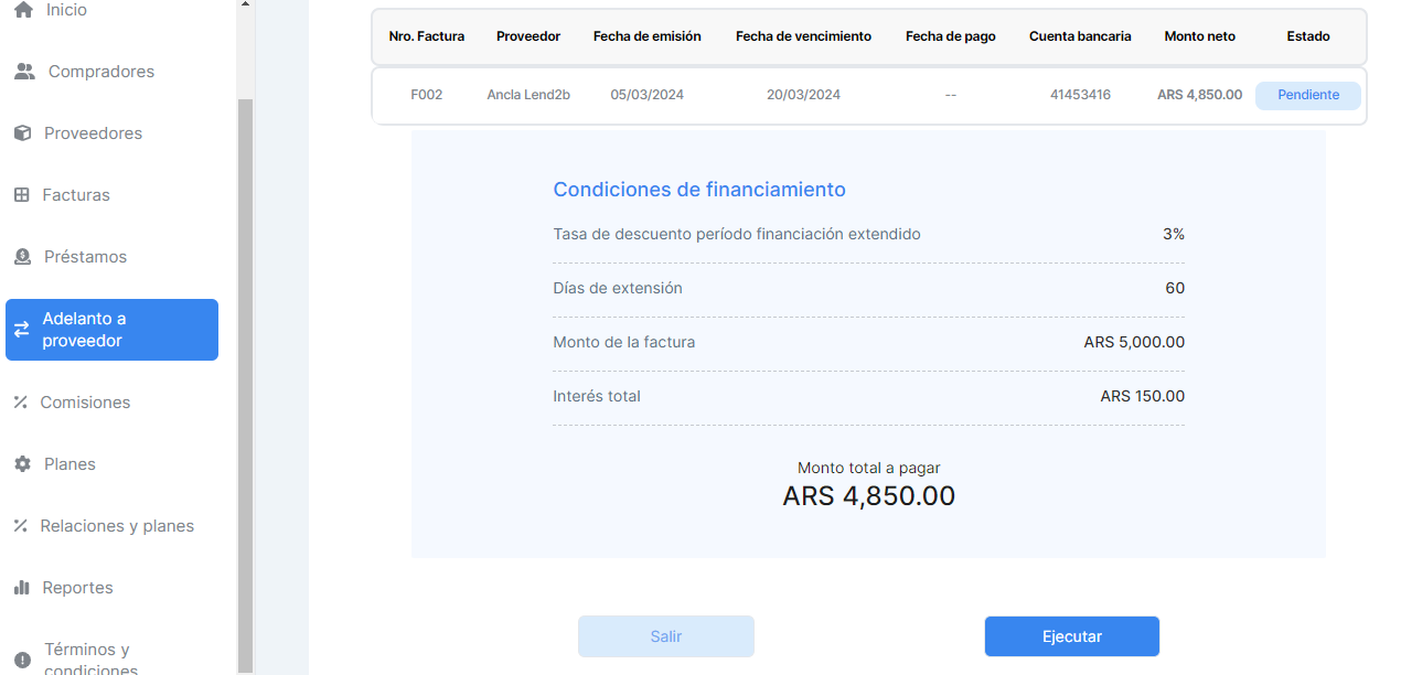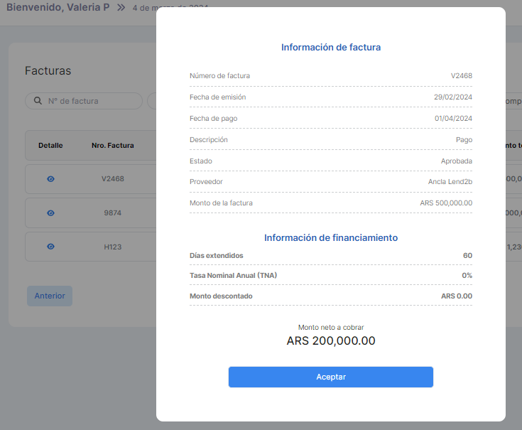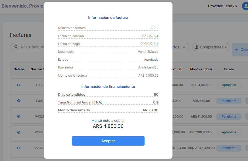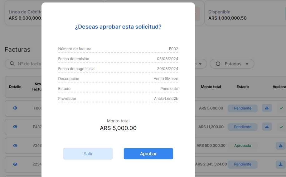 Aprobar factura: dado que estamos haciendo solicitud y aprobación automática de financiamiento base, debe aparecer un cuadro con el siguiente texto: