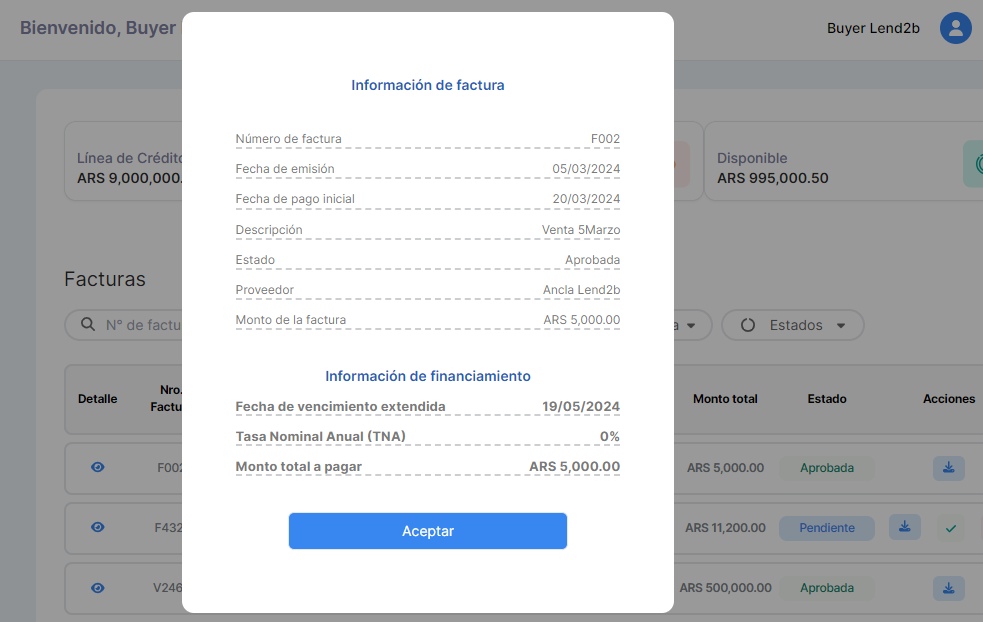 Al dar de alta la presente Factura, usted esta aceptando que, siempre que el comprador tenga disponible en su línea de crédito, esta factura será cancelada por el Lender a los (campo periodo inicial) días de la fecha de emisión informada