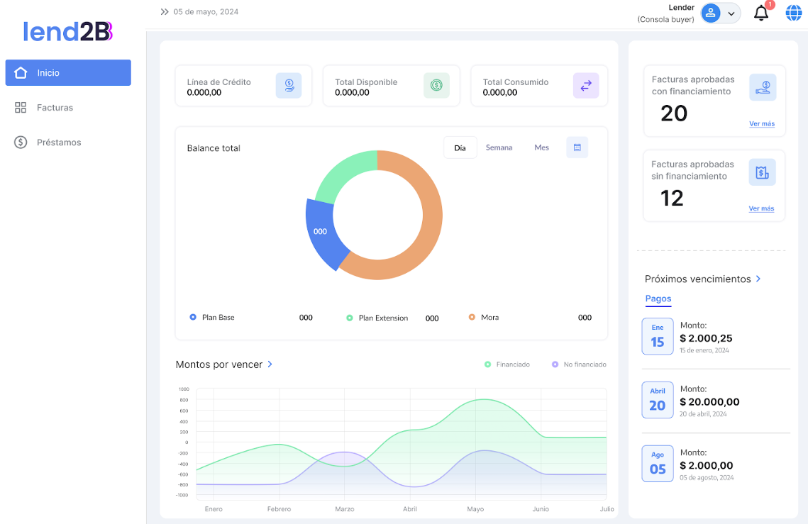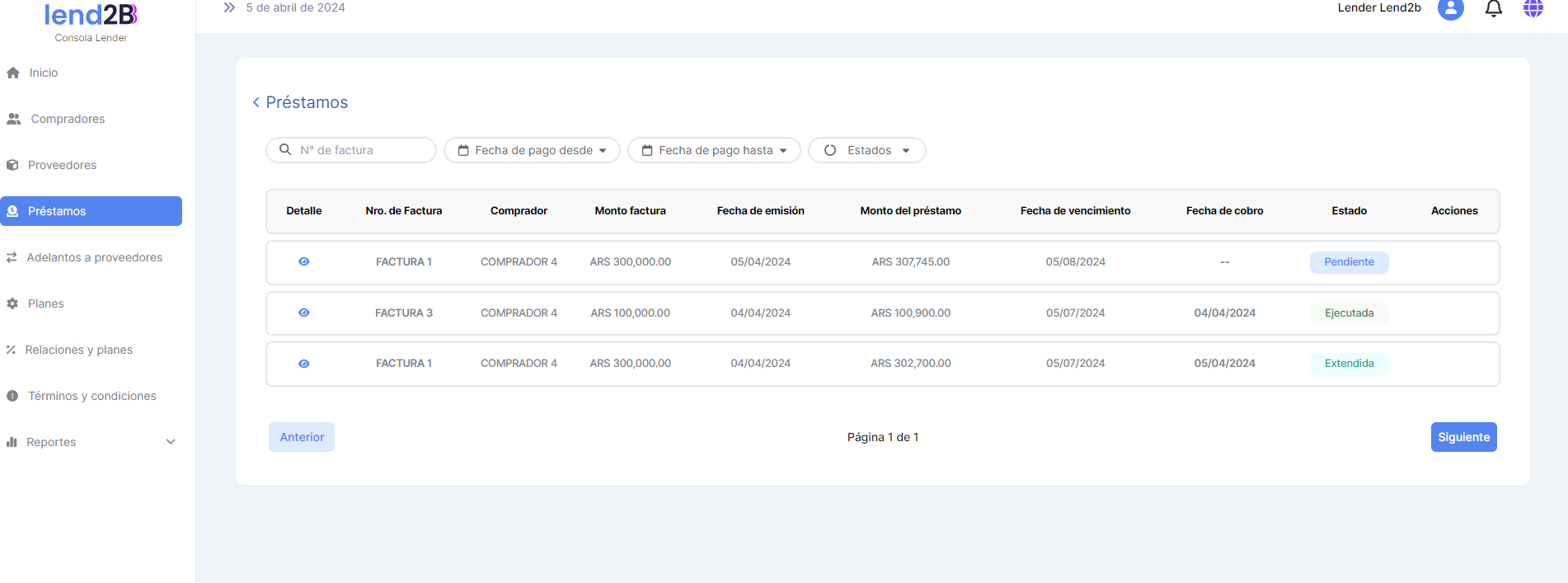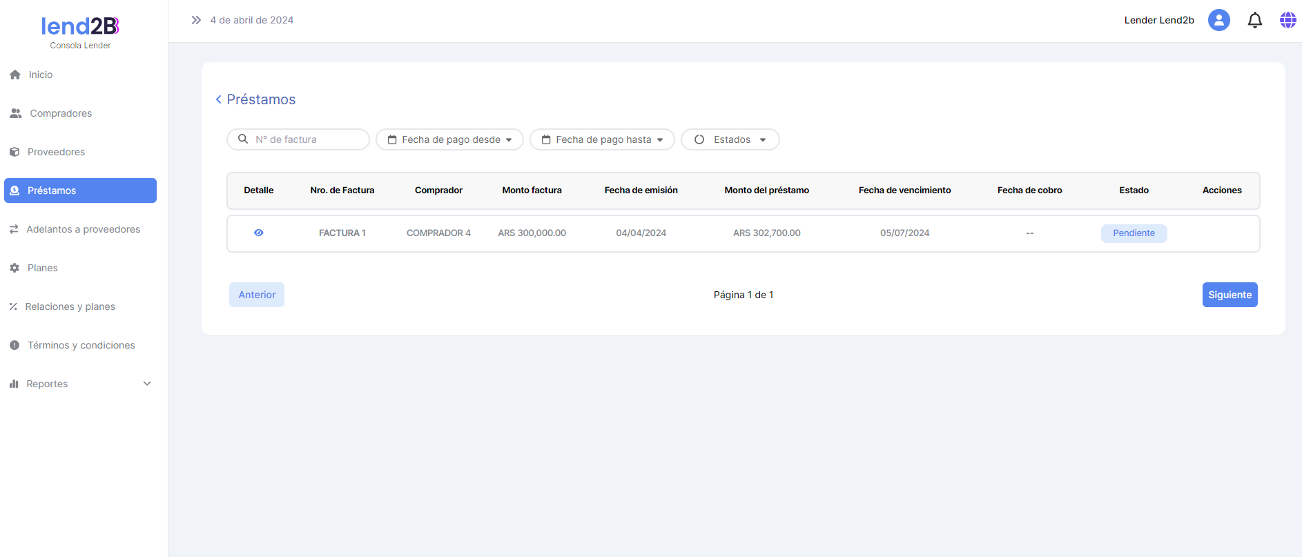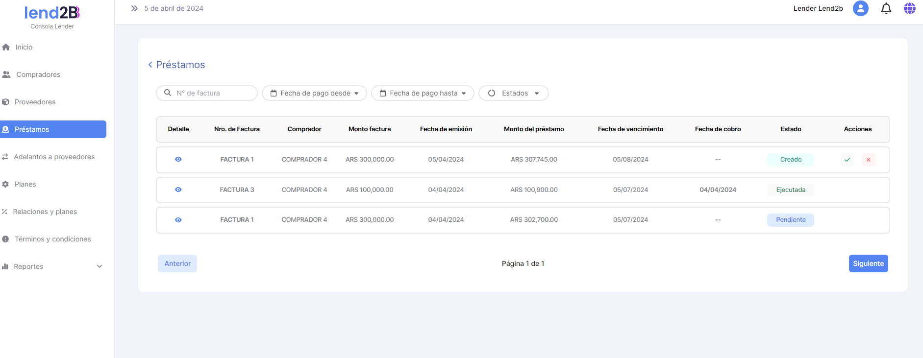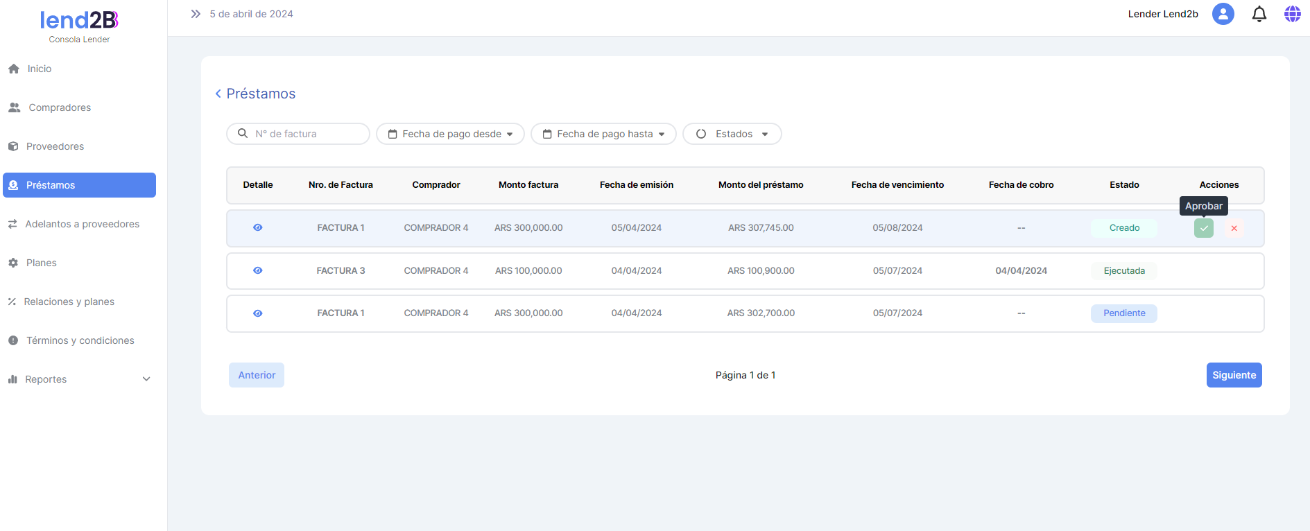 En la Consola Lender, el Préstamo generado por la aceptación de la Factura por parte del Comprador (con línea de crédito disponible), aparece en estado Pendiente.
