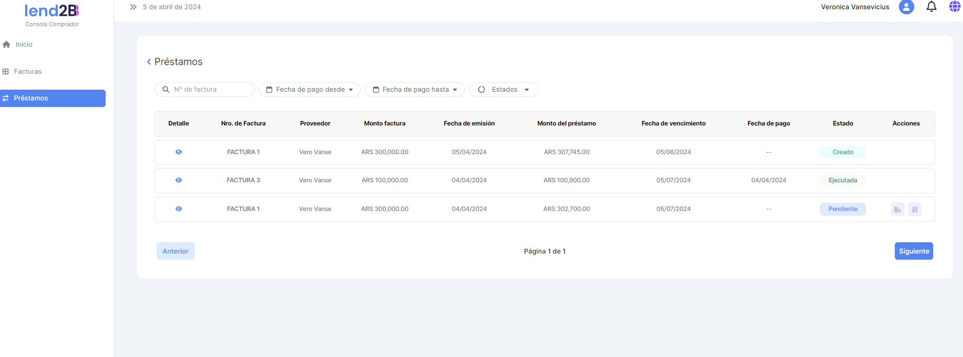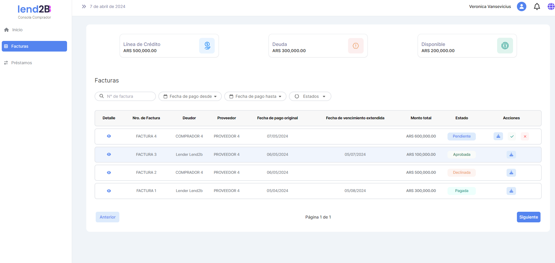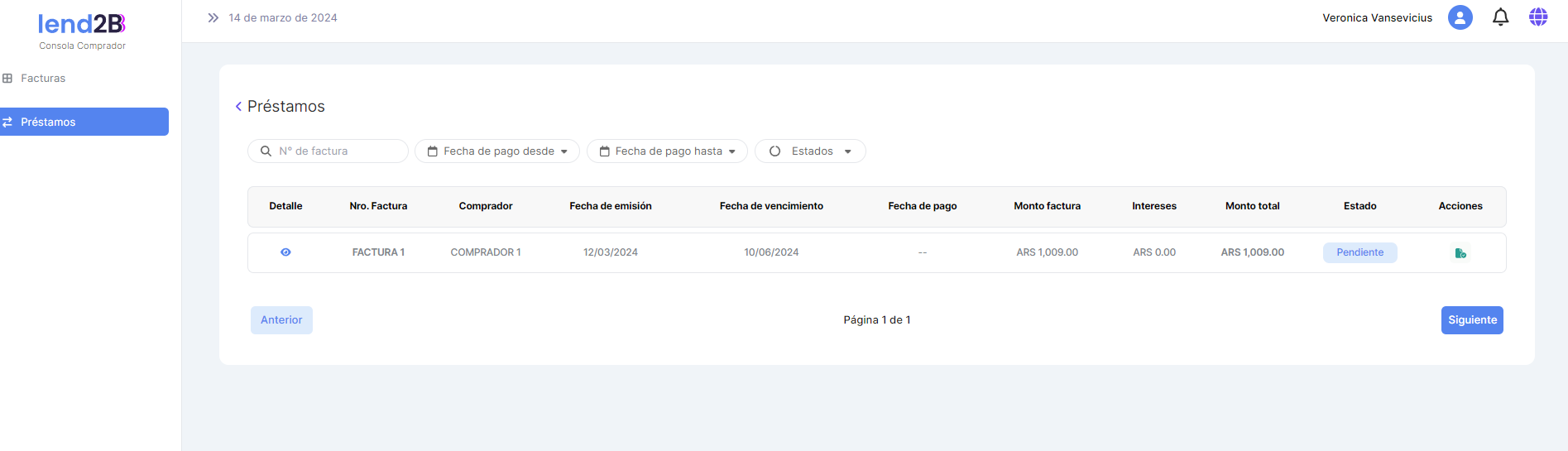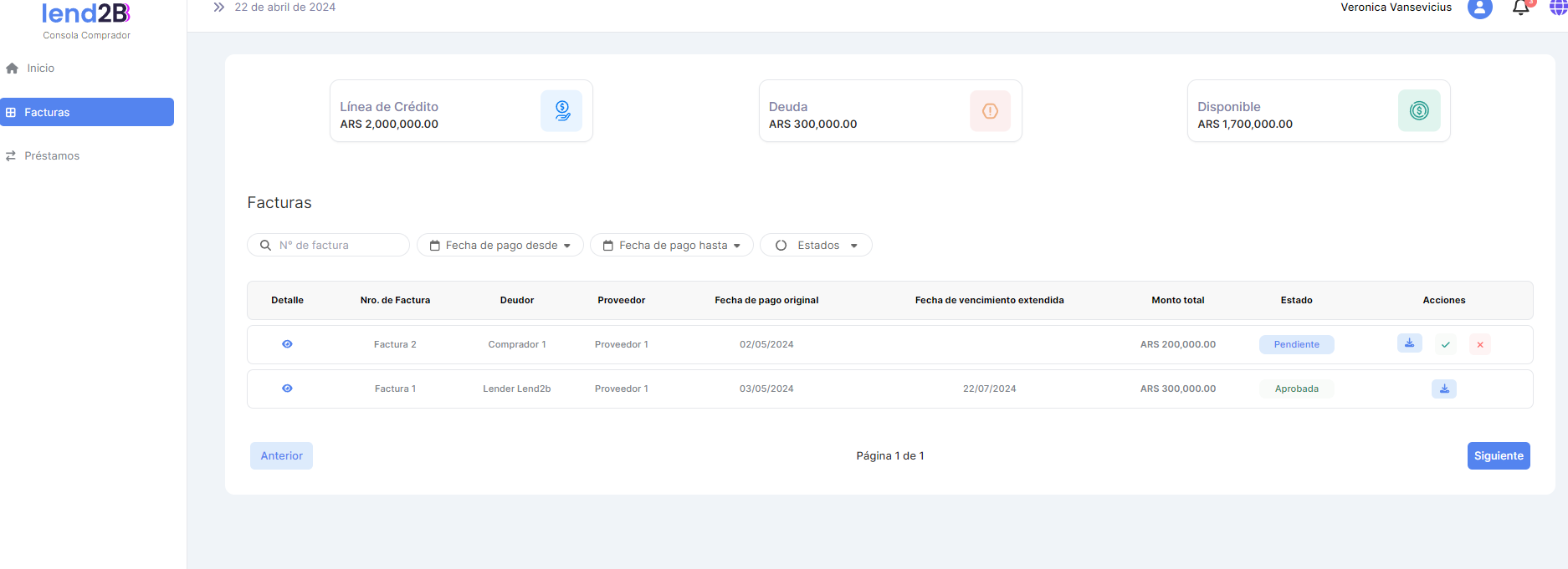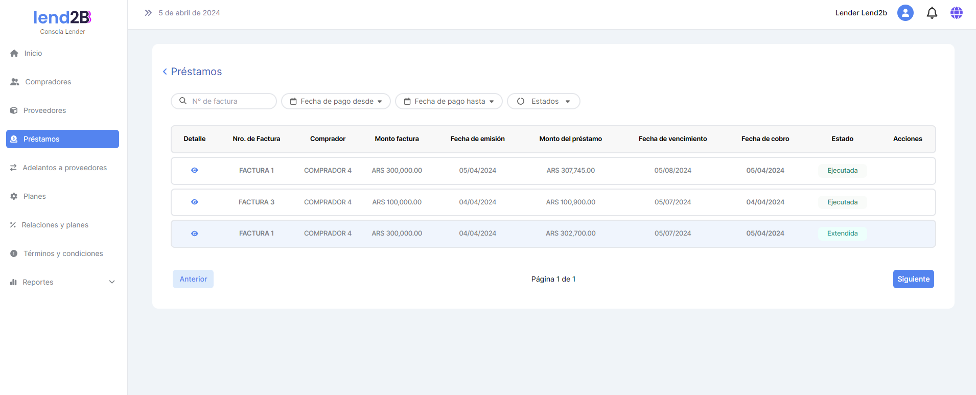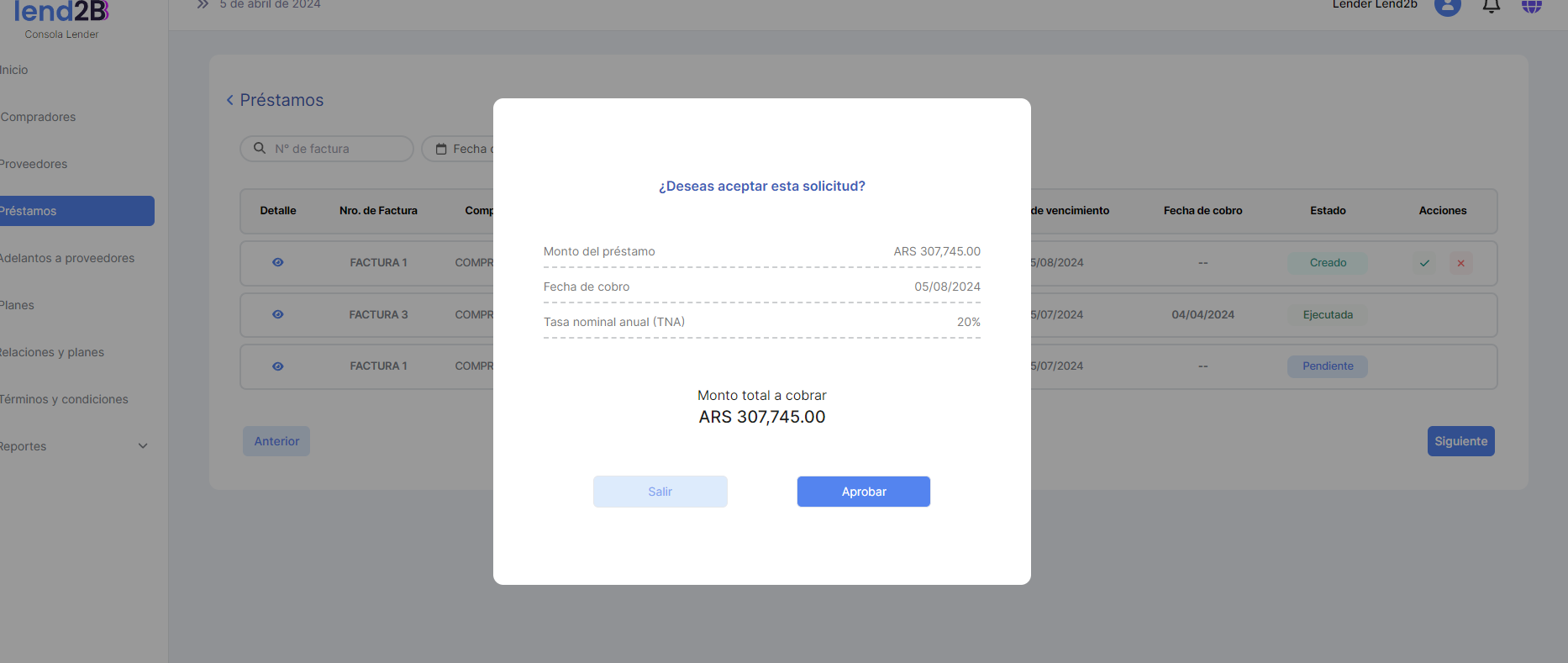 En la Consola Lender, el Préstamo generado por la aceptación de la Factura por parte del Comprador (con línea de crédito disponible), aparece en estado Pendiente.