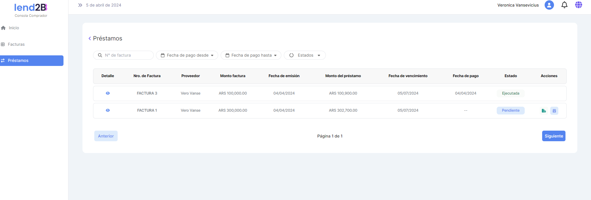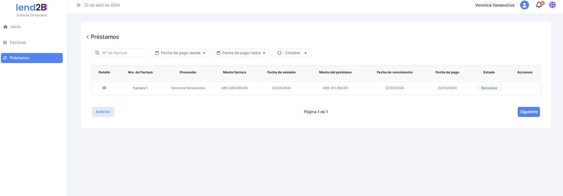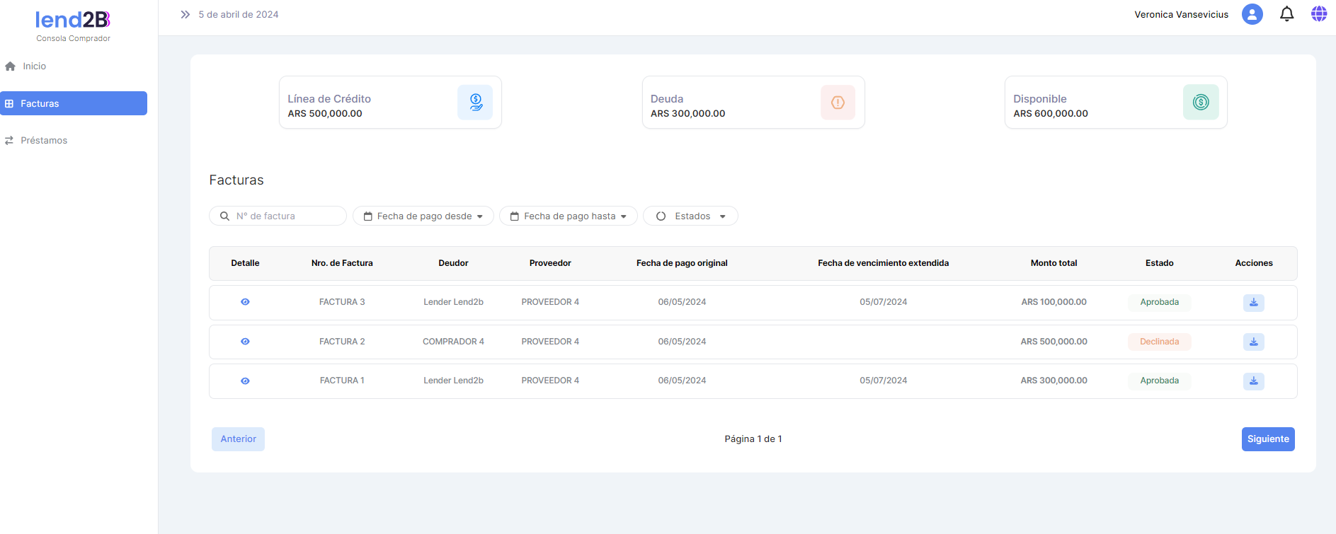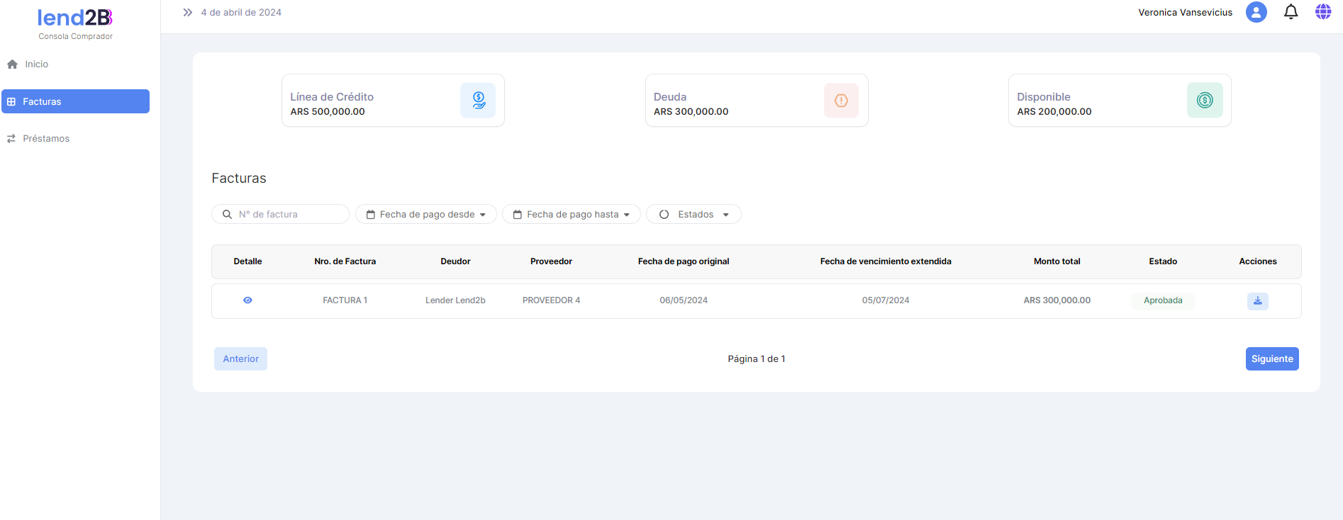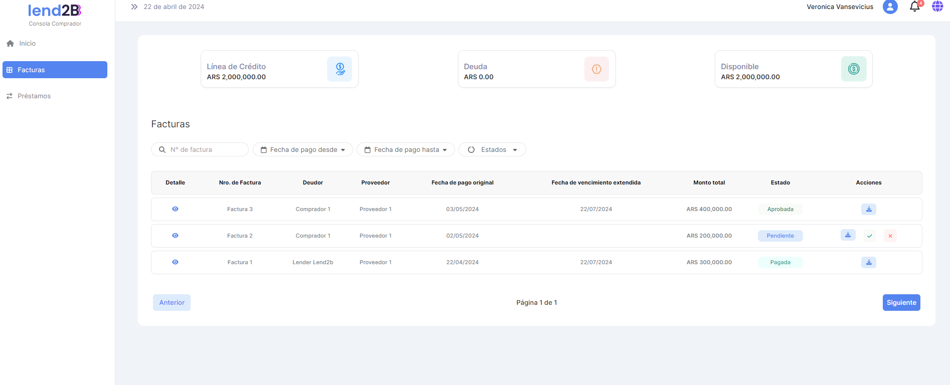 En la Consola Lender, el Préstamo generado por la aceptación de la Factura por parte del Comprador (con línea de crédito disponible), aparece en estado Pendiente.