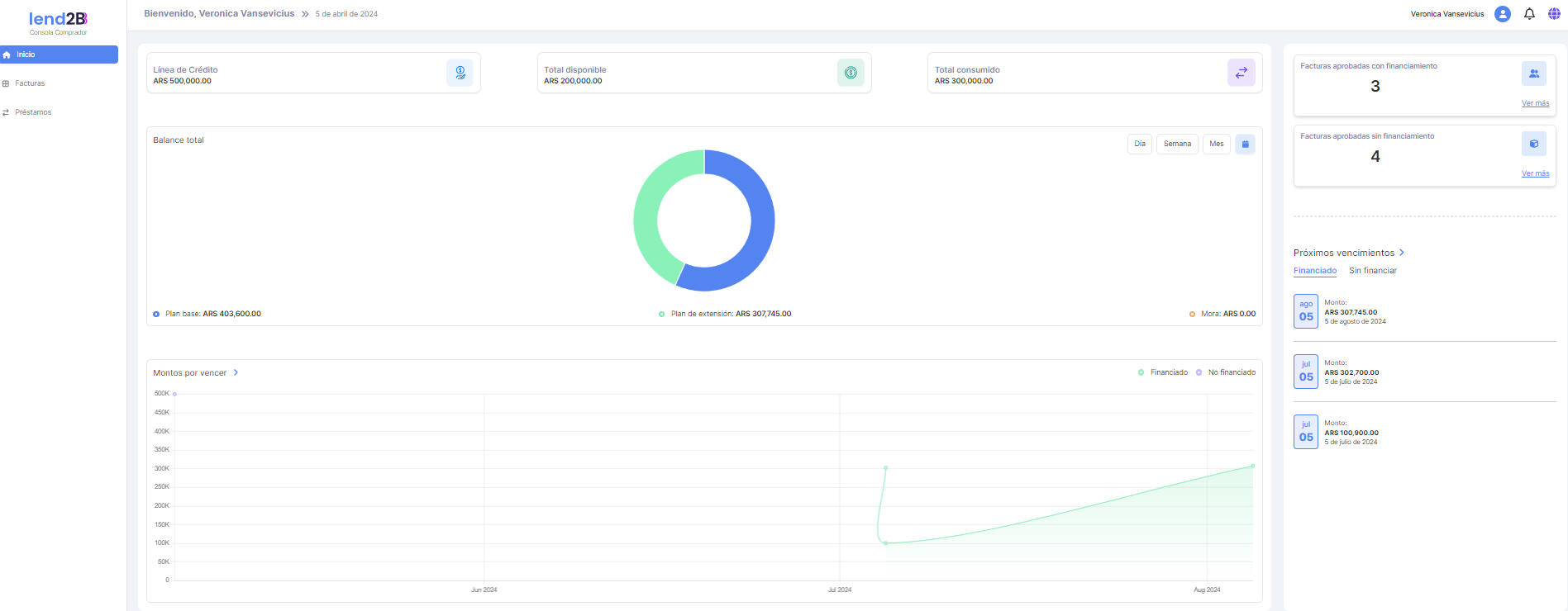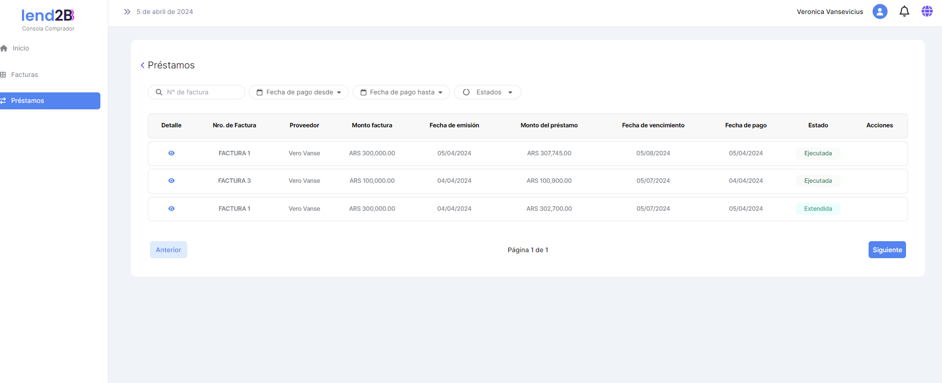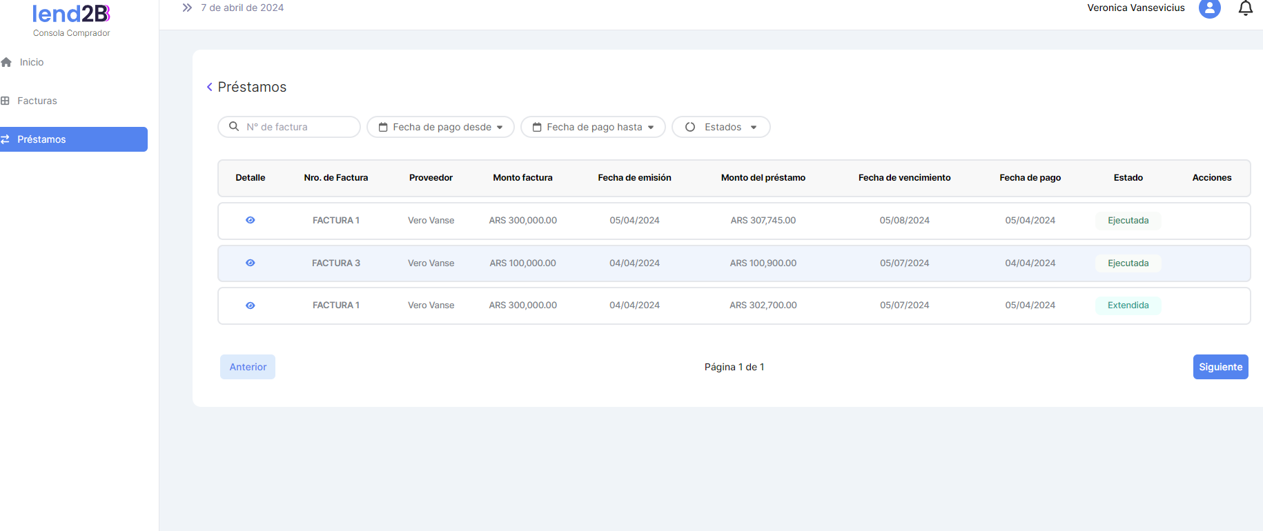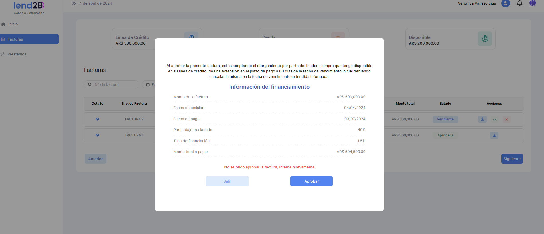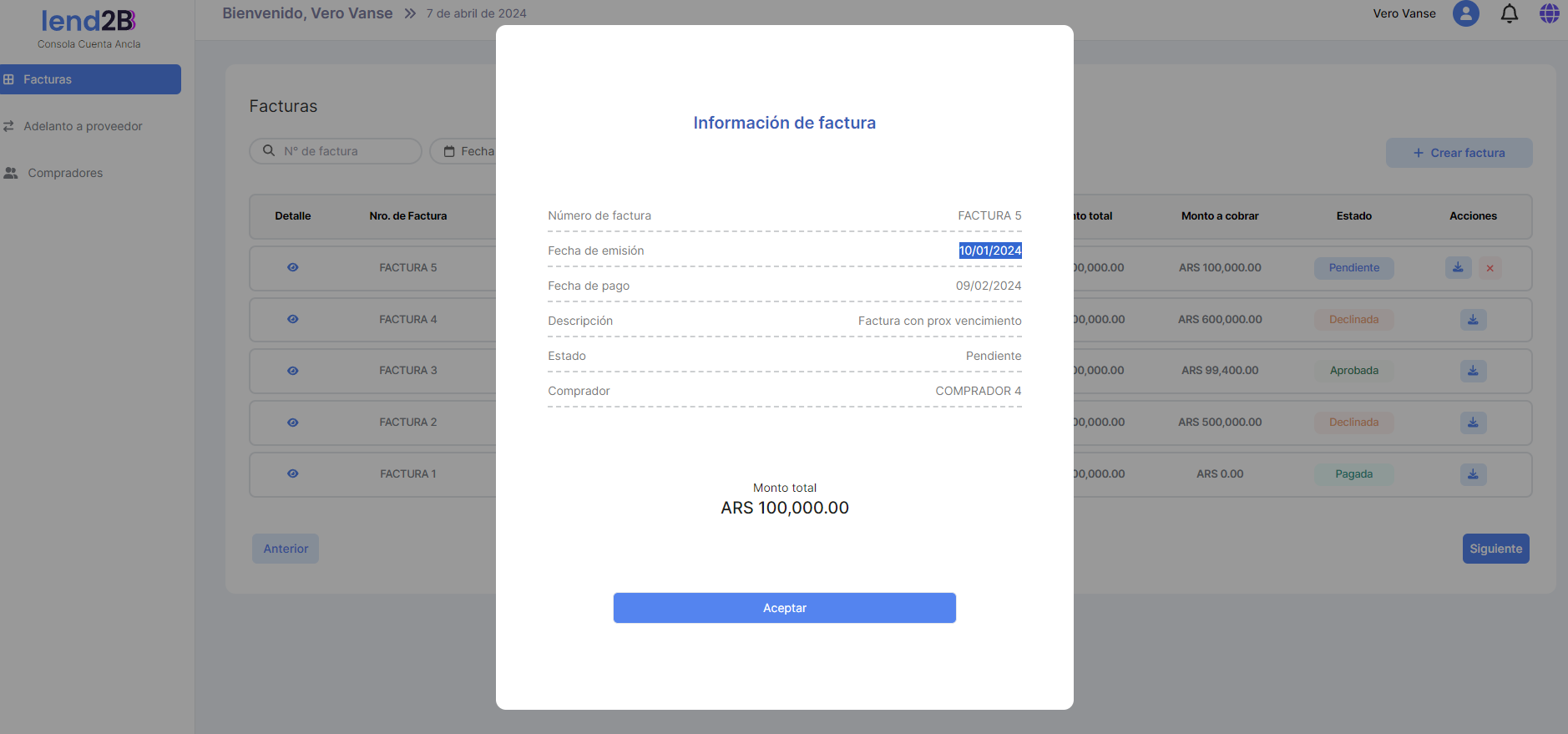 En la Consola Lender, el Préstamo generado por la aceptación de la Factura por parte del Comprador (con línea de crédito disponible), aparece en estado Pendiente.