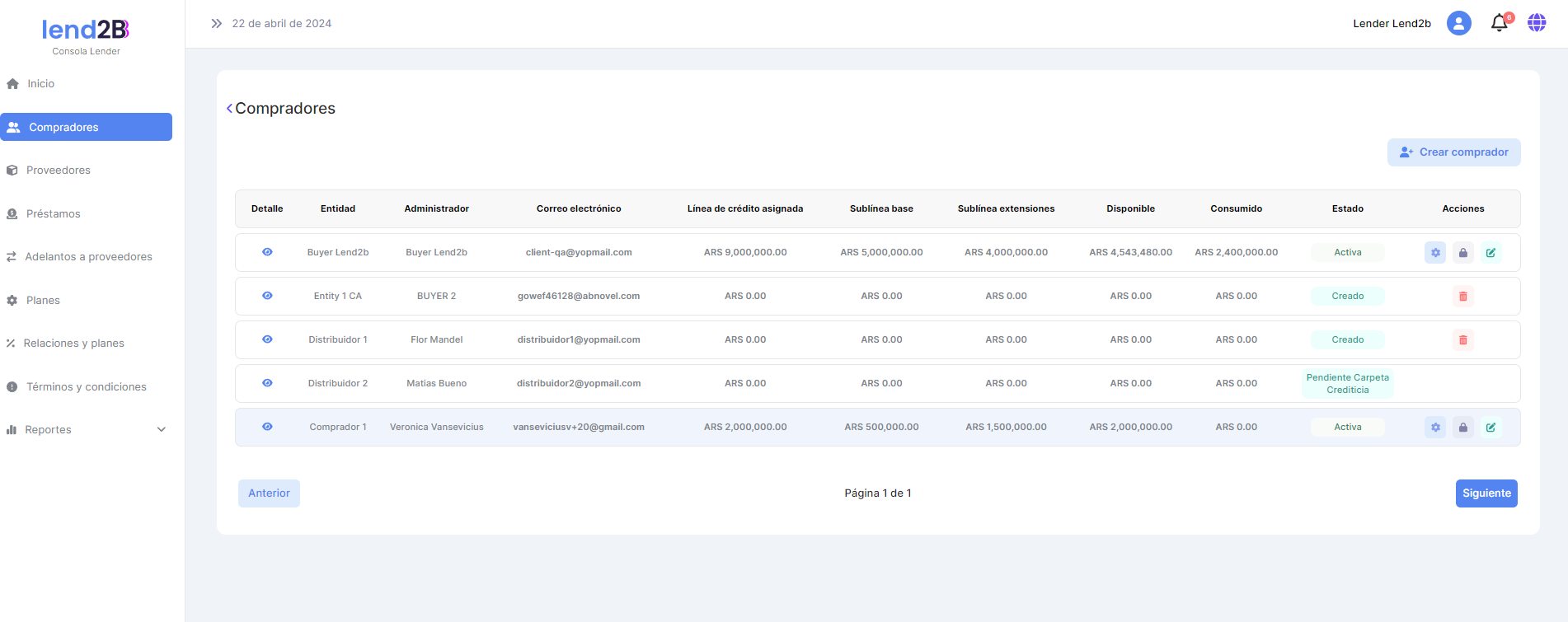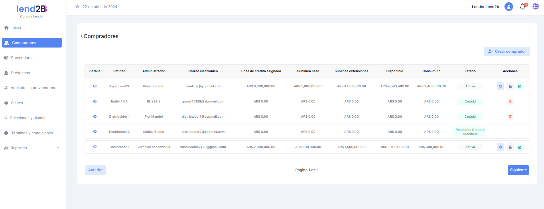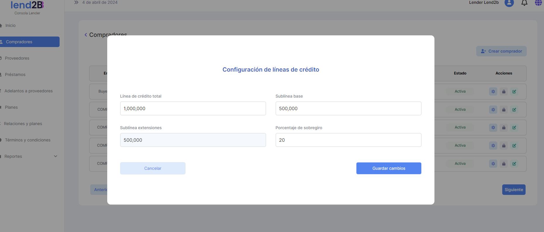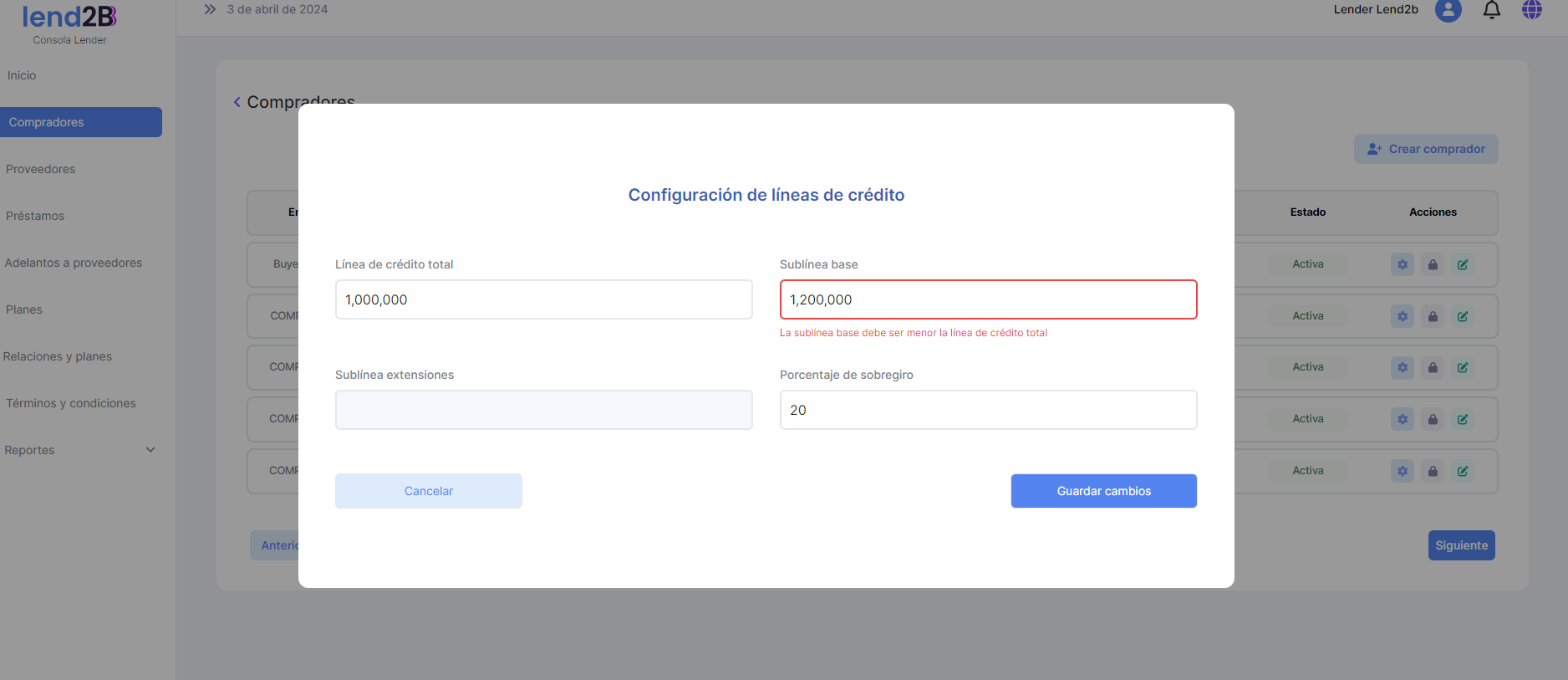 Al ir a la sección Compradores se observa que las Líneas y sublineas de crédito se actualizaron en forma correcta.