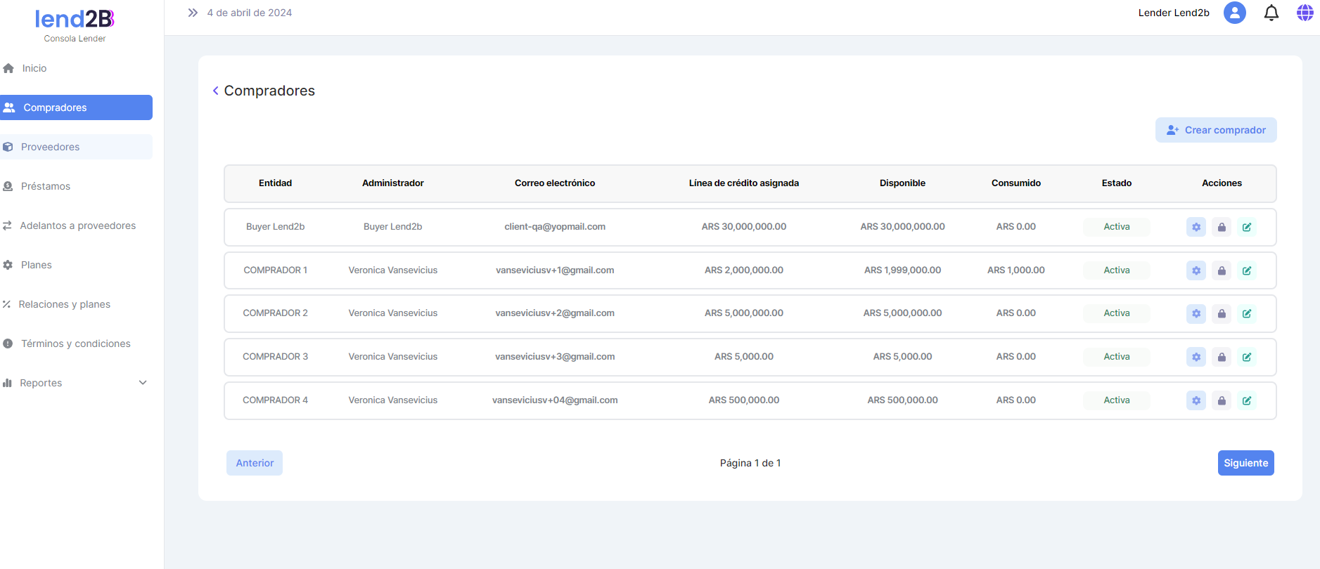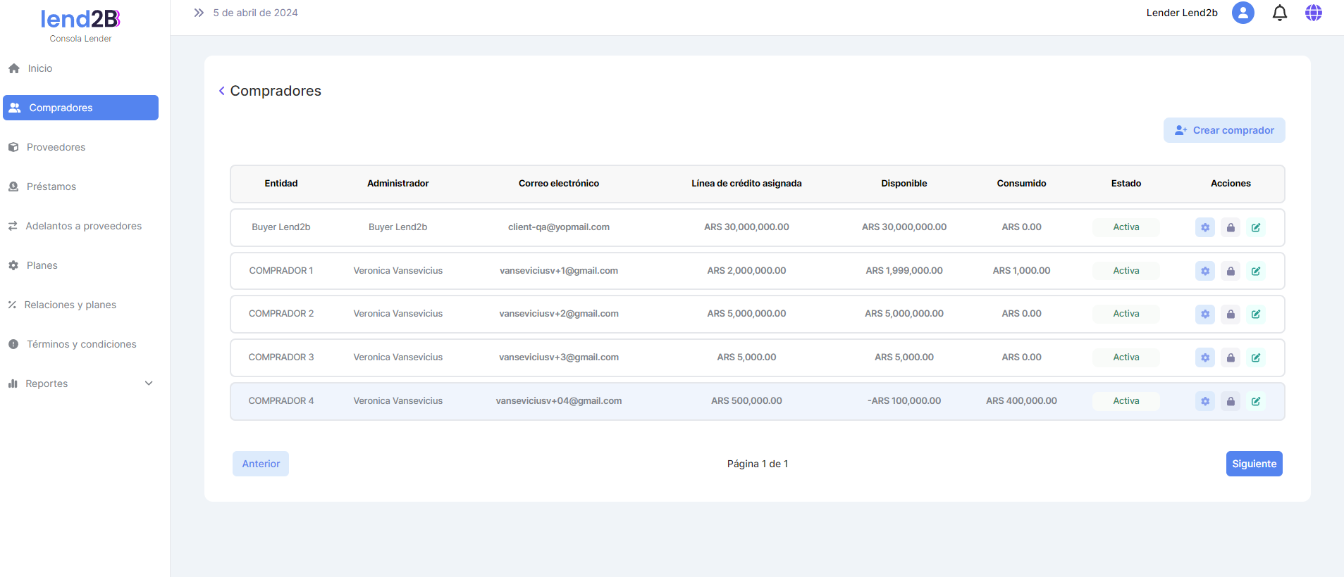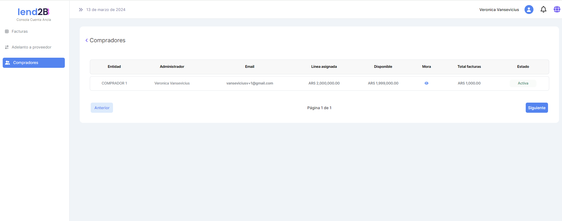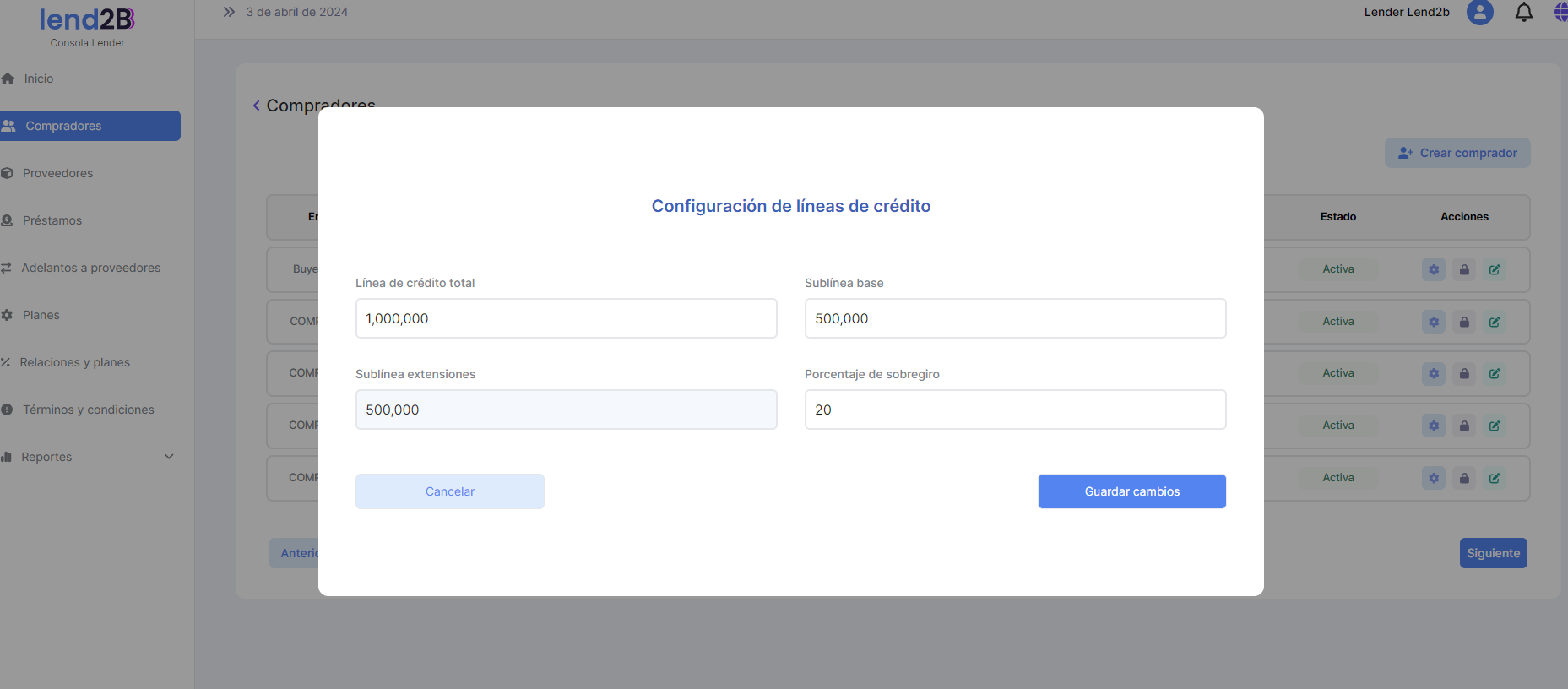 Al ir a la sección Compradores se observa que las Líneas y sublineas de crédito se actualizaron en forma correcta.