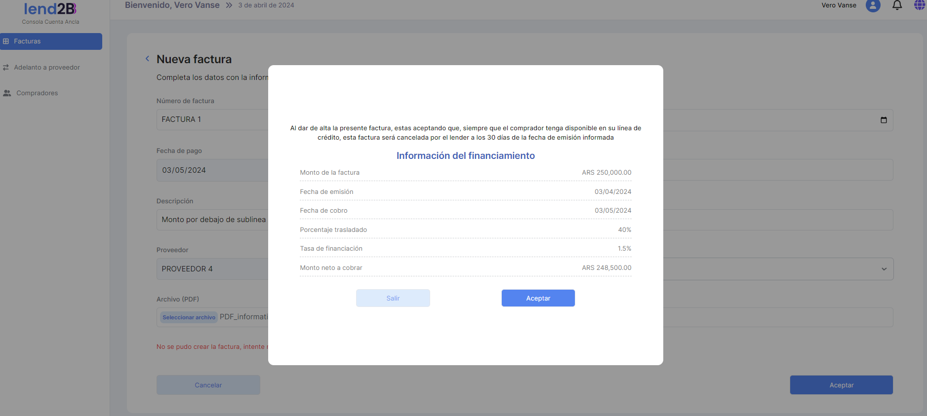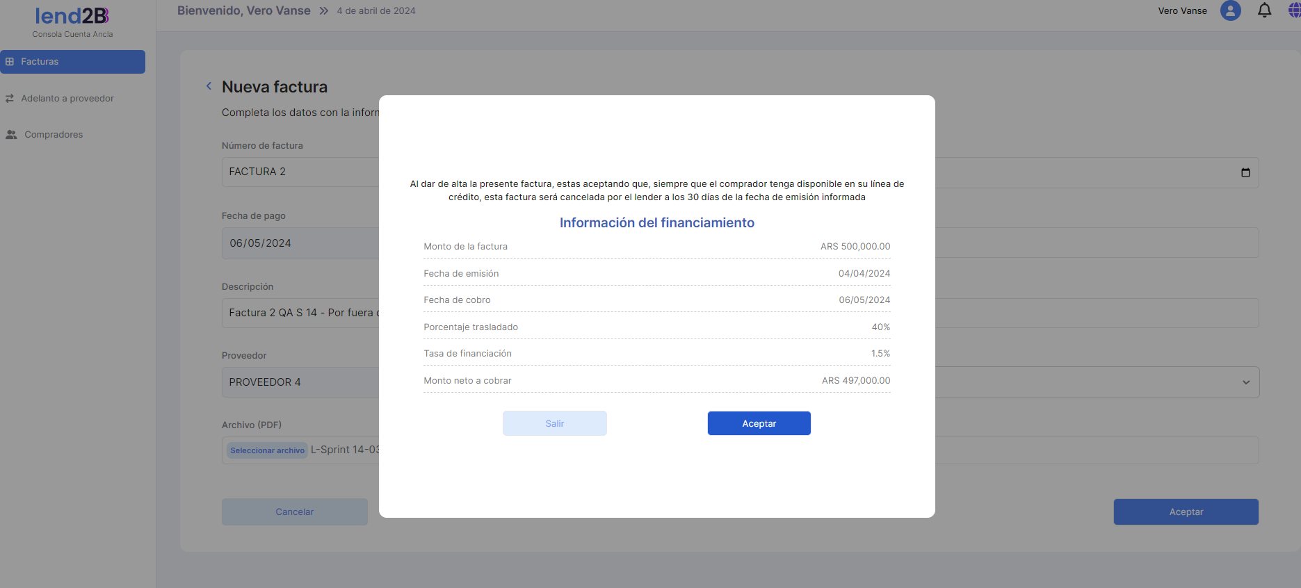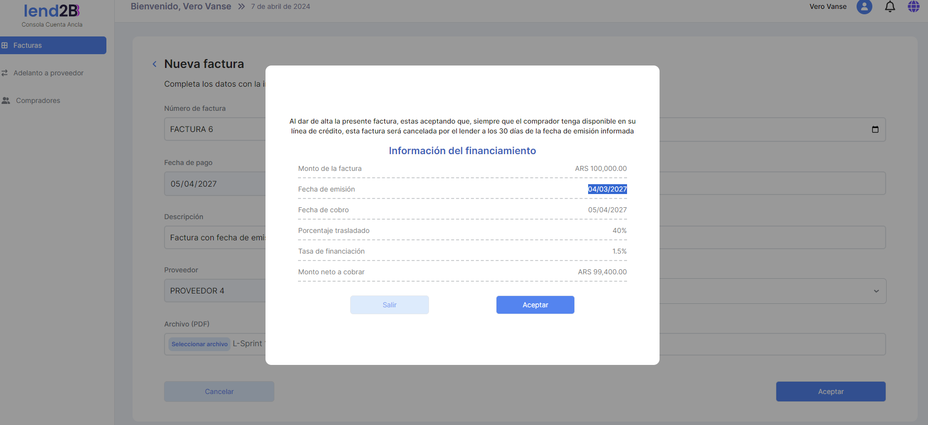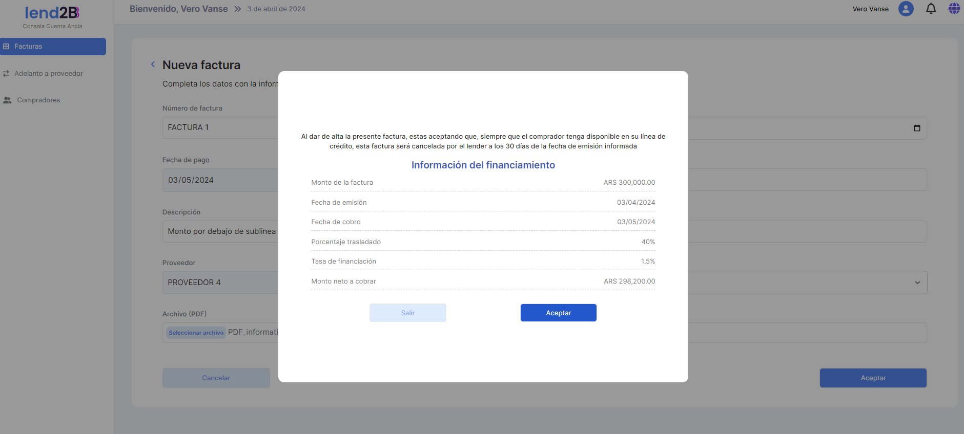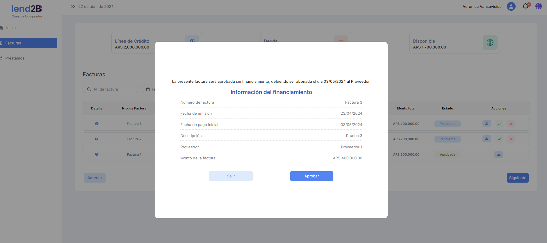 Al aprobar la Factura, se observa el descuento del monto de la misma sobre la Línea total de crédito, como así también la Deuda y el Disponible.