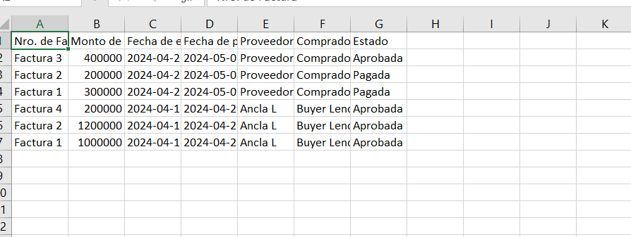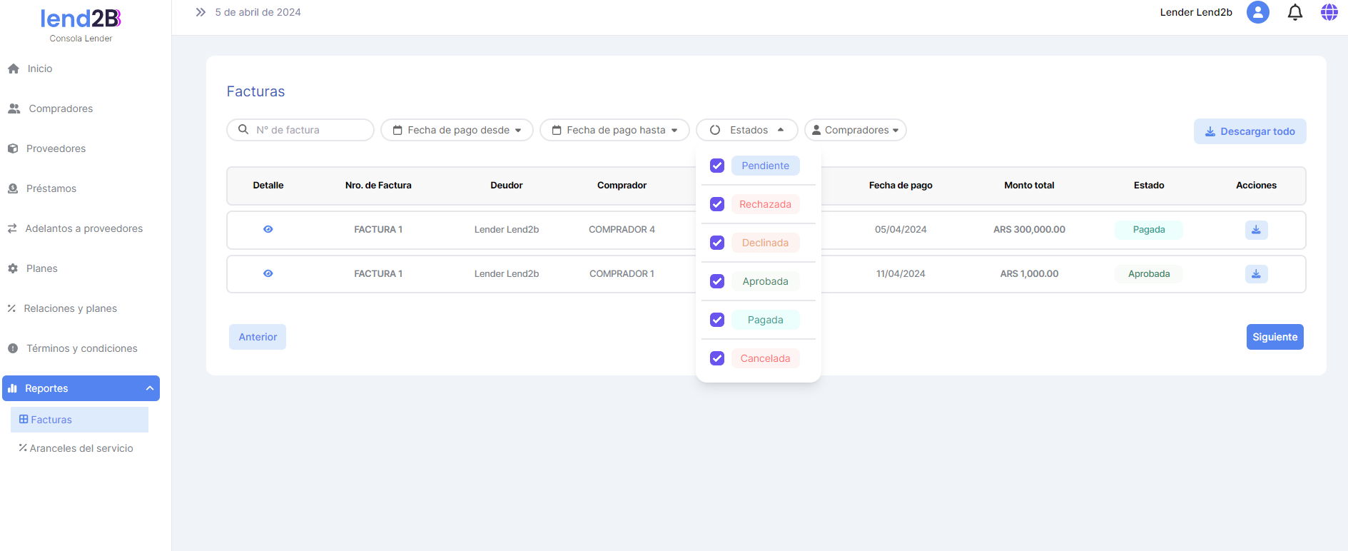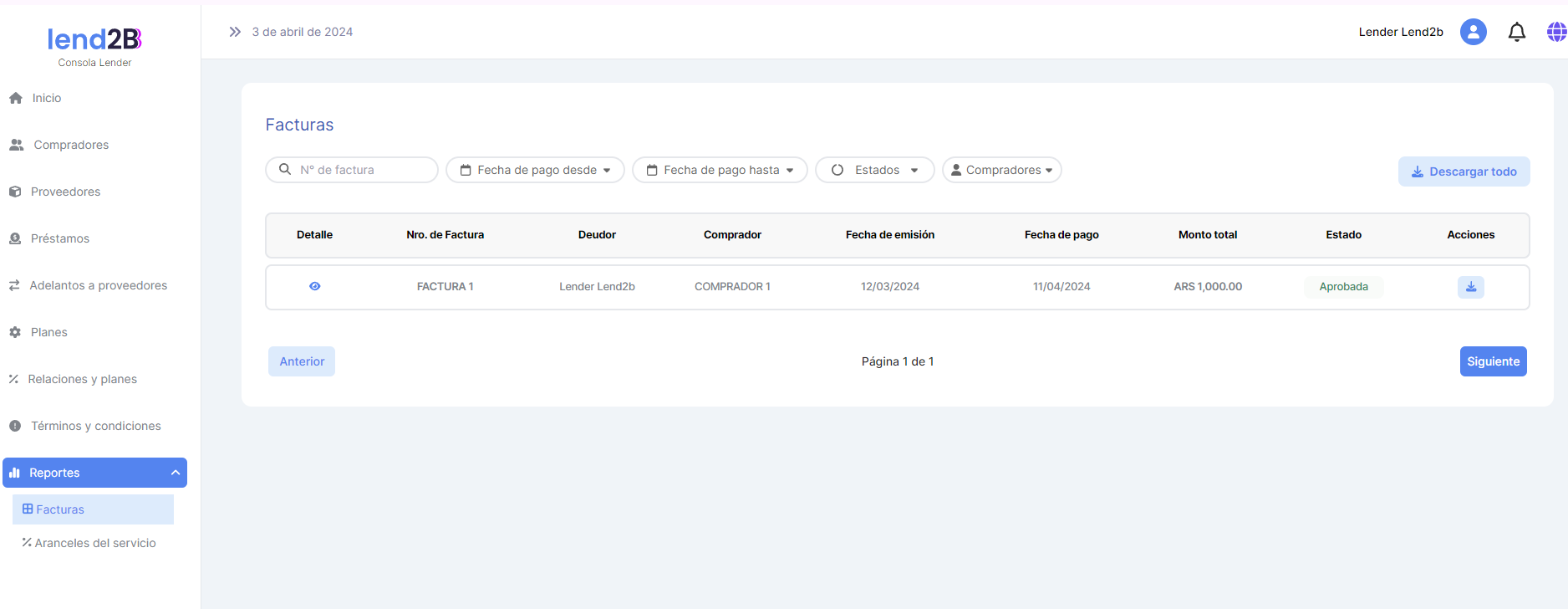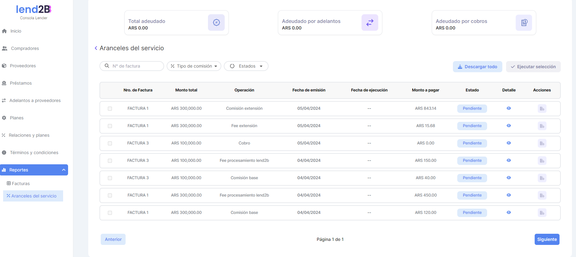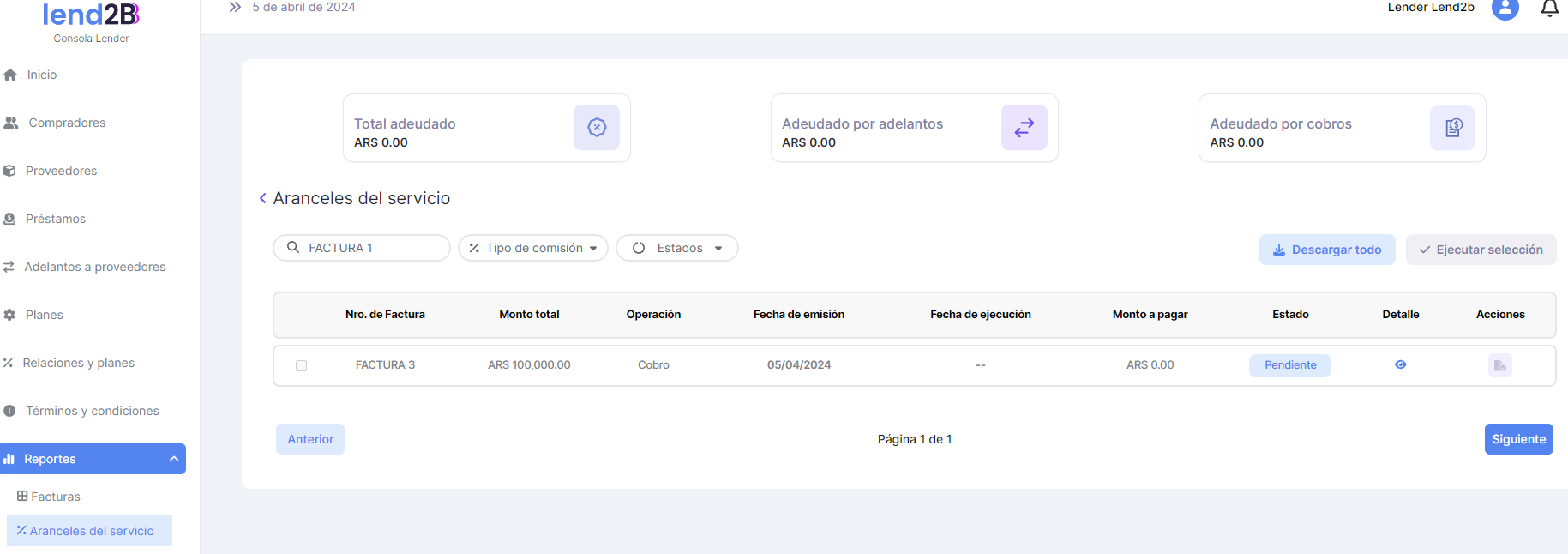 Una vez que el Lender selecciona que reporte quiere ver se accede al detalle actual tanto de Facturas como de Aranceles del Servicio