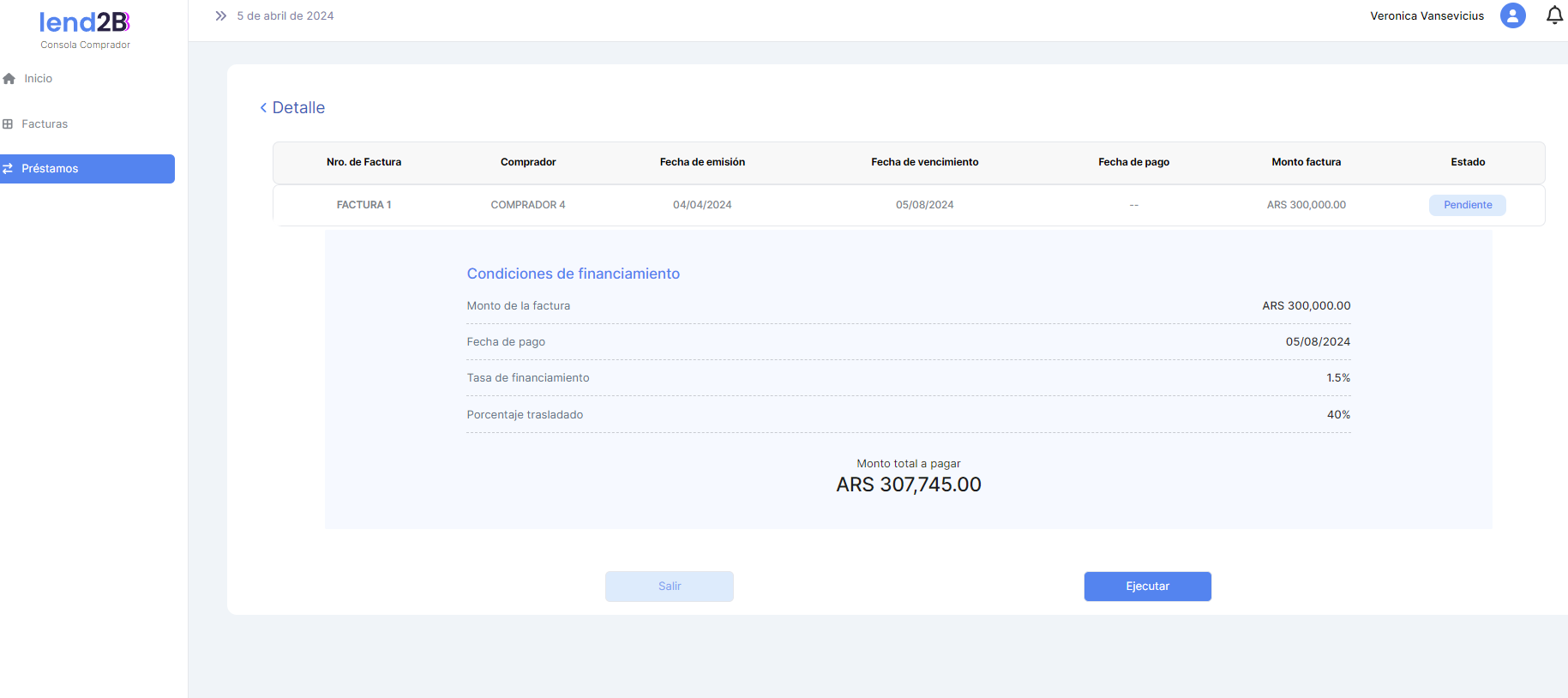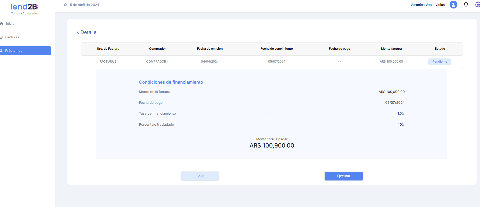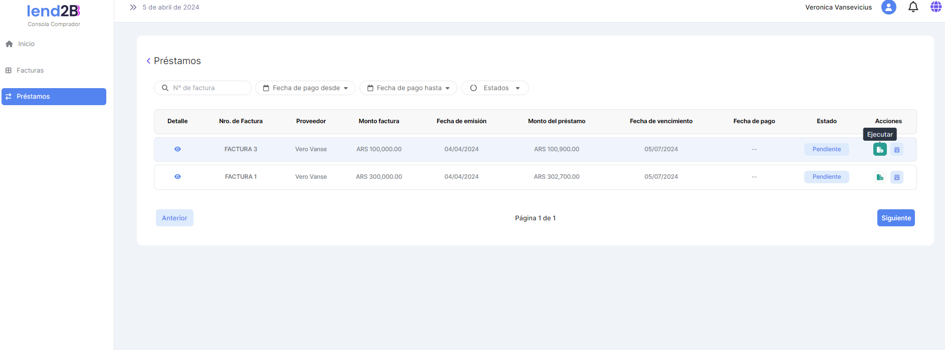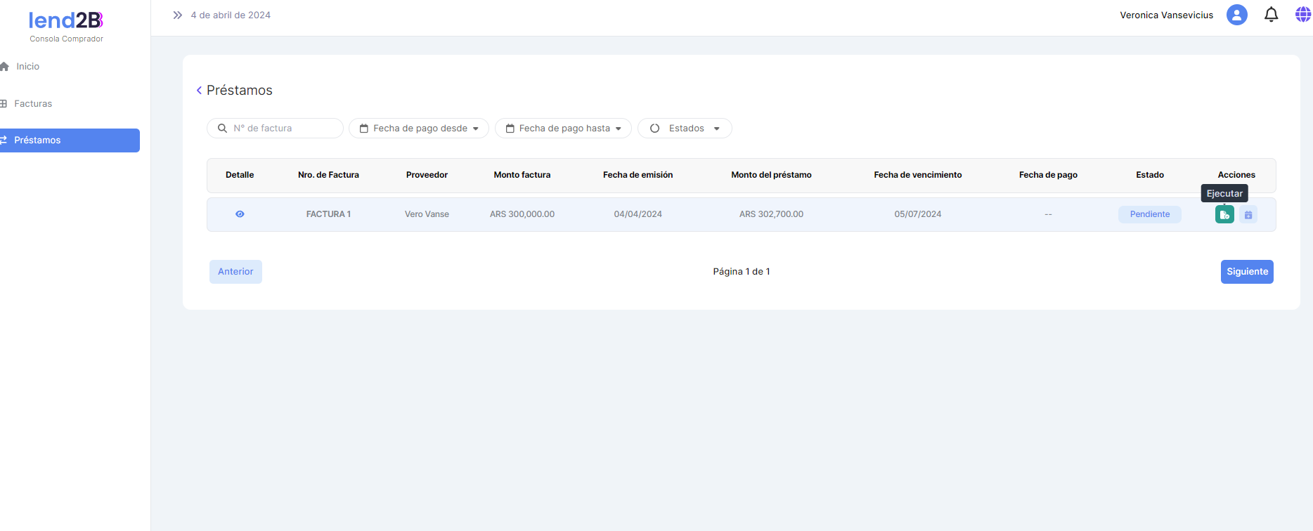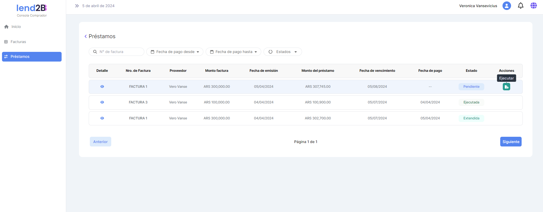 Solo para el Préstamo extendido en estado Pendiente queda habilitada la acción Ejecutar.