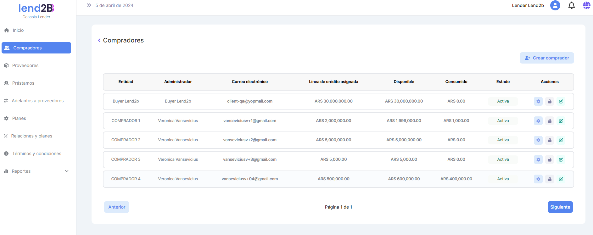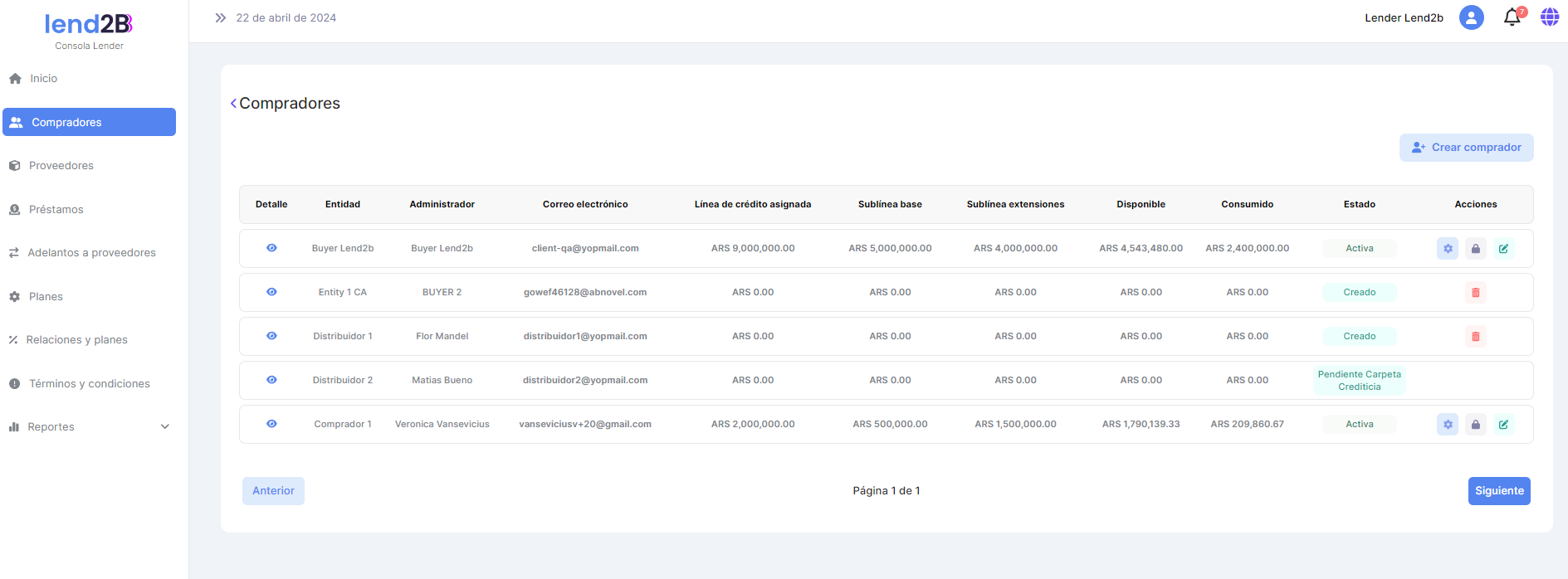 Al solicitar el Comprador el Préstamo extendido se visualiza el mismo en la Consola Lender en estado Creado.