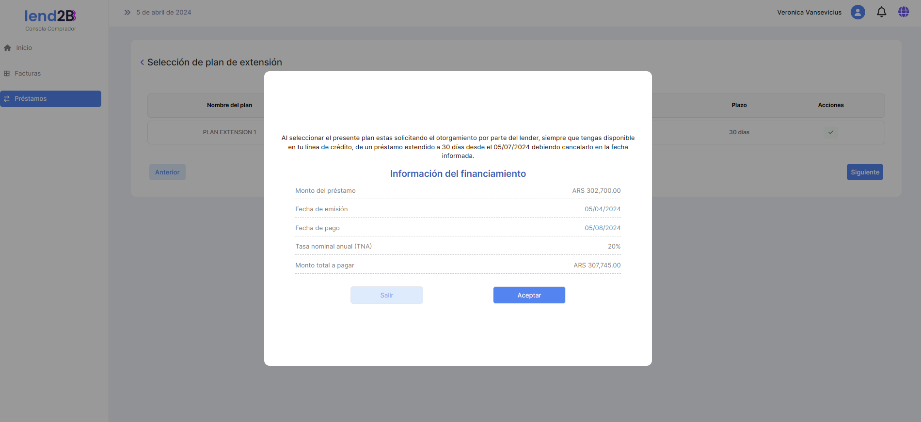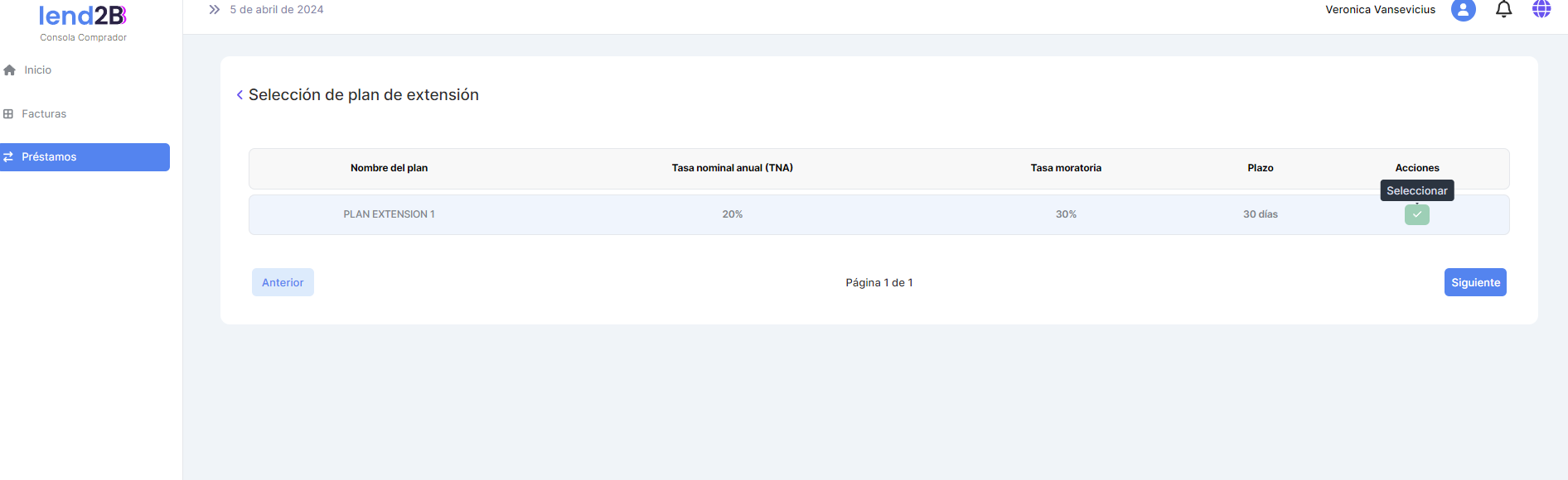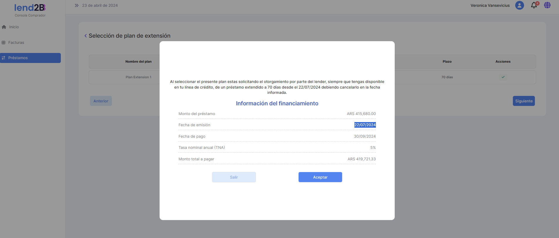 Al aceptar el Comprador los datos asociados al préstamo extendido se observa que se genera una nueva línea en el detalle con es estado Creado.