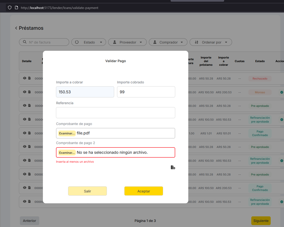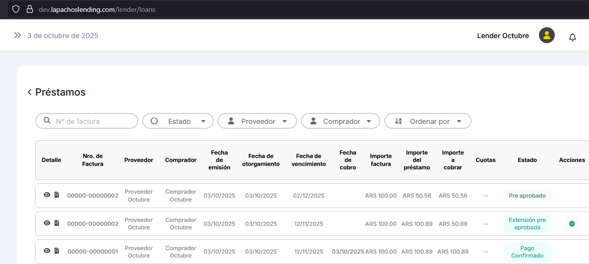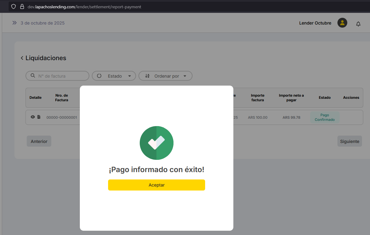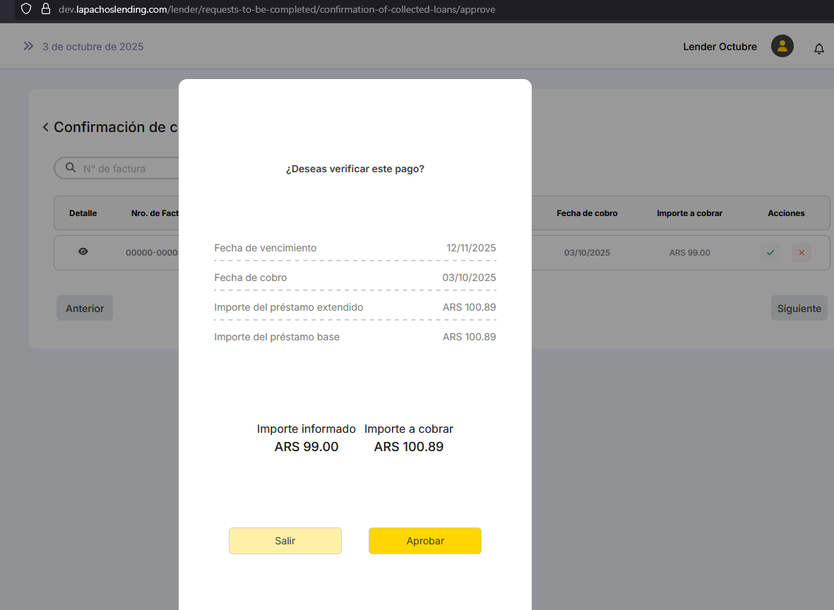 Frontend: En la consola lender al Confirmar el pago, el modal muestra el texto “Importe del prestamos extendido“ y este fue un préstamo base.