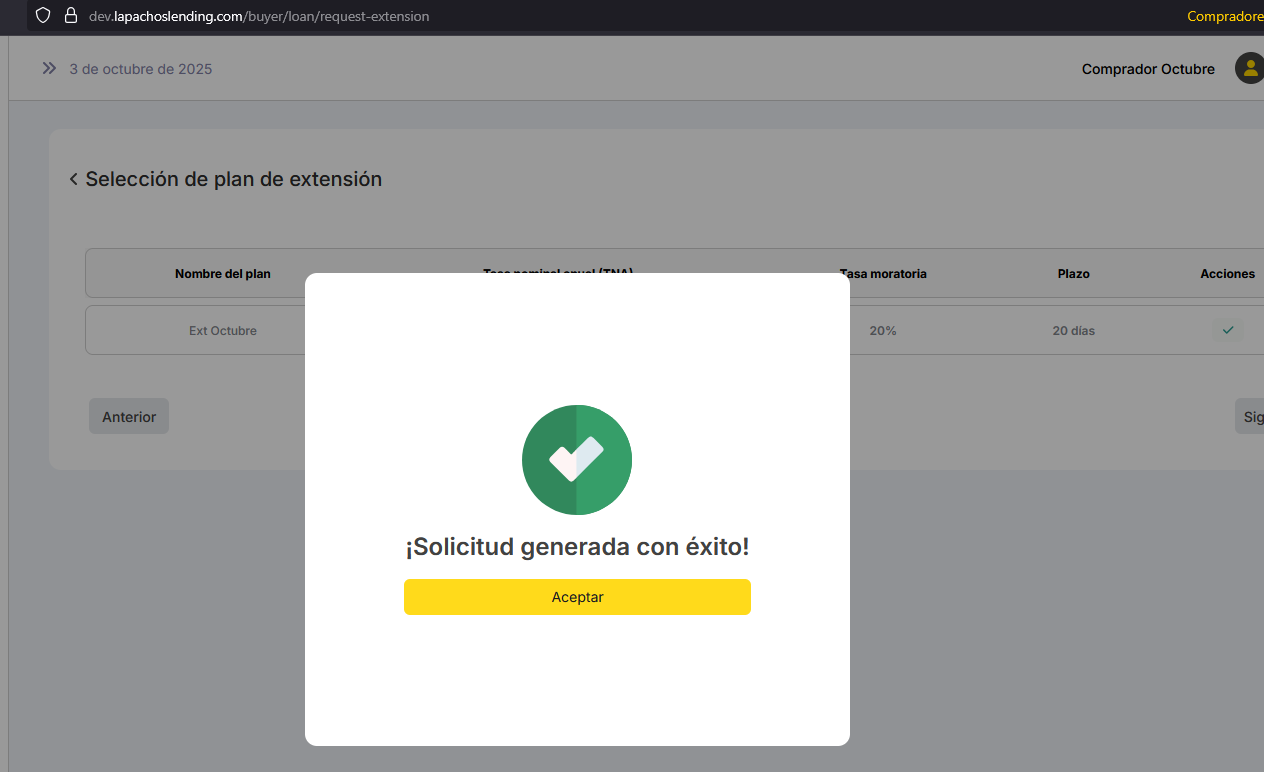 Frontend: Revisar este modal de confirmación que sale detrás del formulario, es decir, al solicitar la extensión y aceptar, hay que cerrar ese modal para ver el modal de confirmación. Pasa igual cuando se solicita refinanciacion.