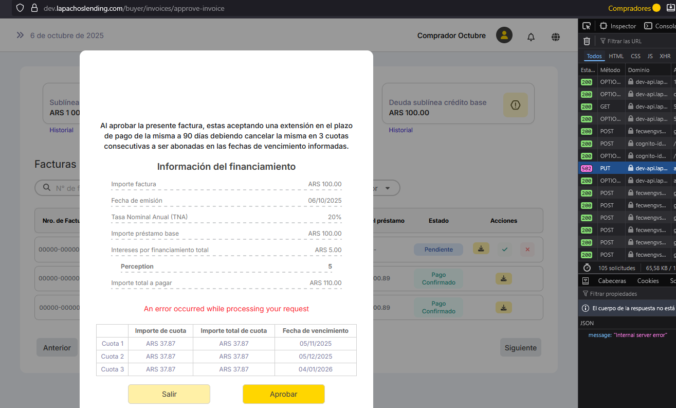 Backend: Aprobar préstamo con plan a cuotas por parte del comprador retorna error, sin embargo el préstamo se aprueba.