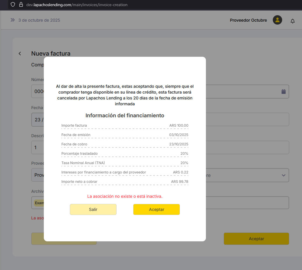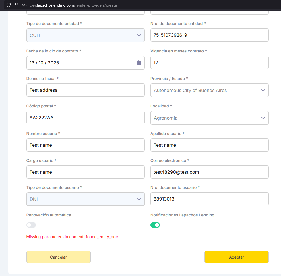 Consola Lender, al crear un proveedor muestra el siguiente error al momento de enviar el formulario
