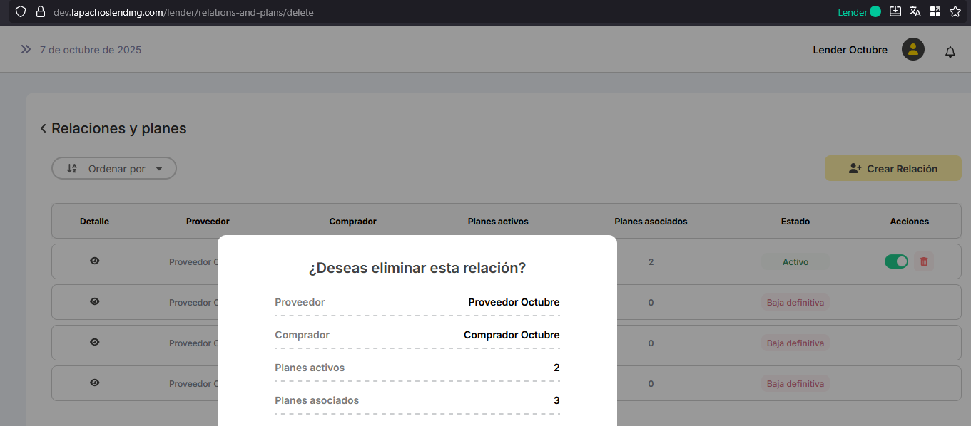 En el detalle de la relación comercial, cuando se da de baja uno de los planes, se inactiva la accion de “Eliminar”, agregar un filtro para que so se muestre ese botón de eliminar.