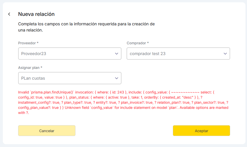 Al aprobar factura con plan sale el siguiente error de la imagen
