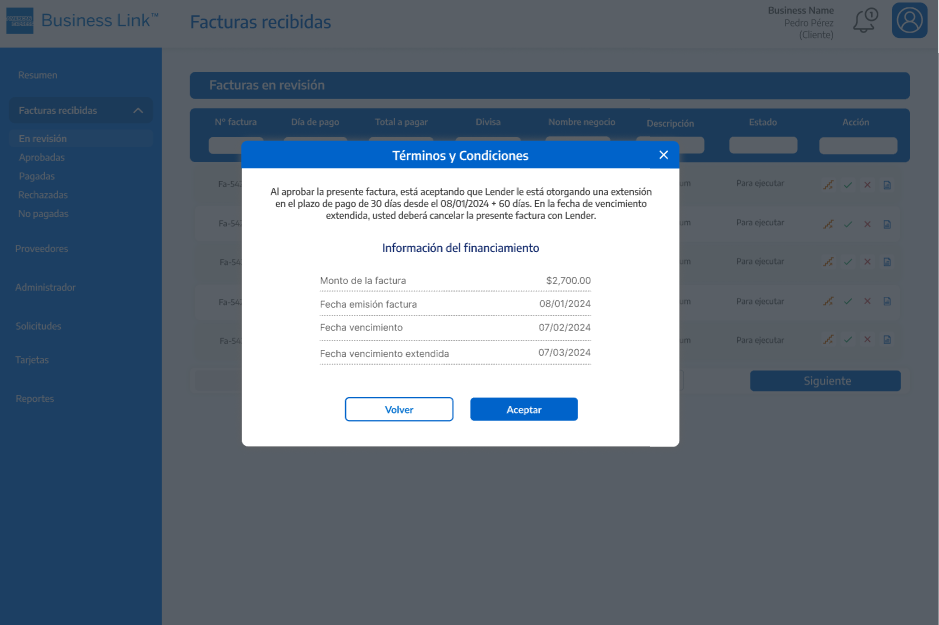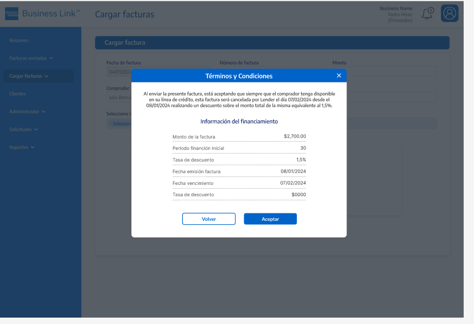 Al Aceptar la Factura se le muestra al Comprador las condiciones comerciales asociadas al financiamiento (a costo del Proveedor) siempre que el mismo tenga disponible en su línea de crédito