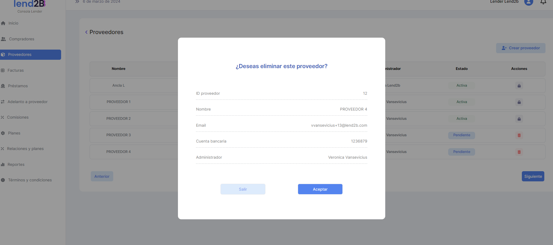 Para un proveedor en estado Pendiente se puede eliminar el registro