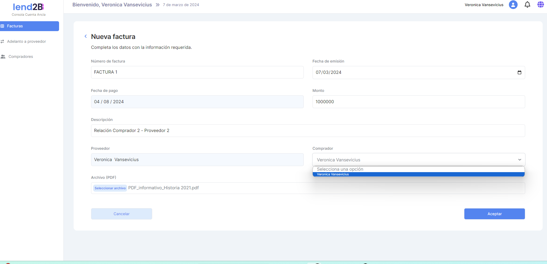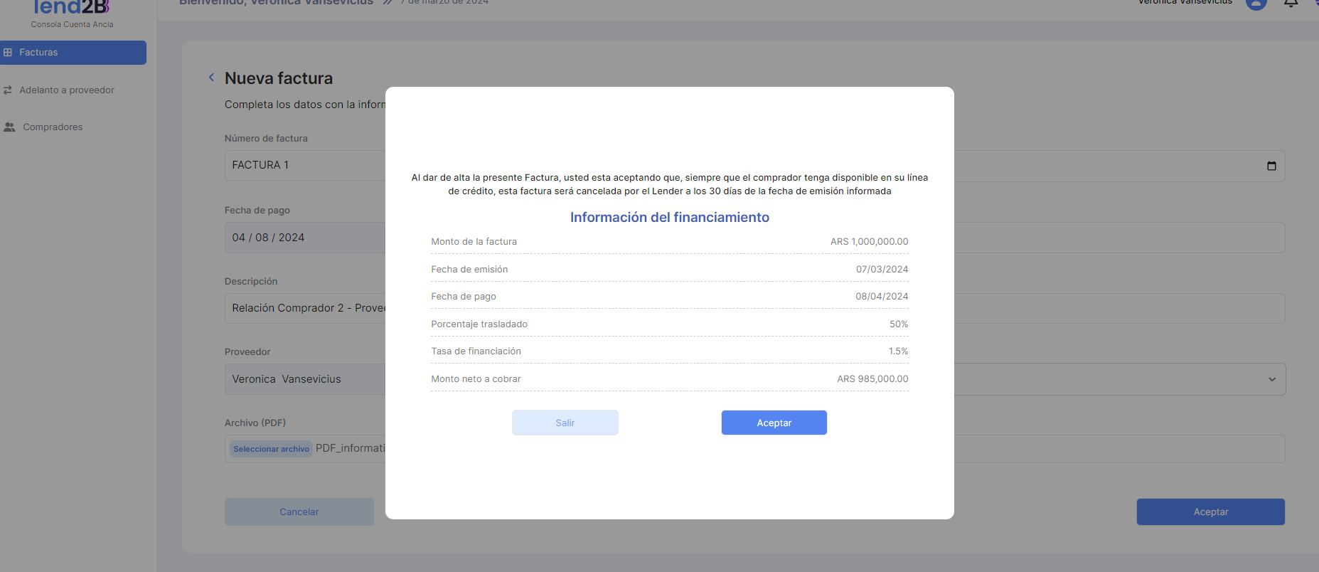 Al querer aceptar la Factura se observa un error en el calculo del monto del financiamiento dado que no esta contemplando el porcentaje de traslado (50%). Adicionalmente la fecha de pago es errónea dado que esta contando 60 días en vez de 90 desde la fecha de emisión.