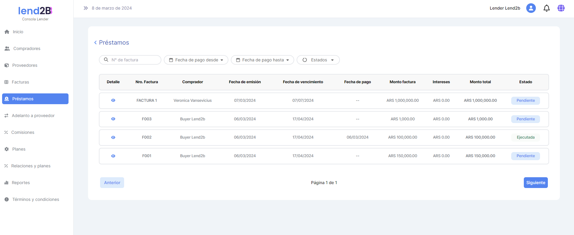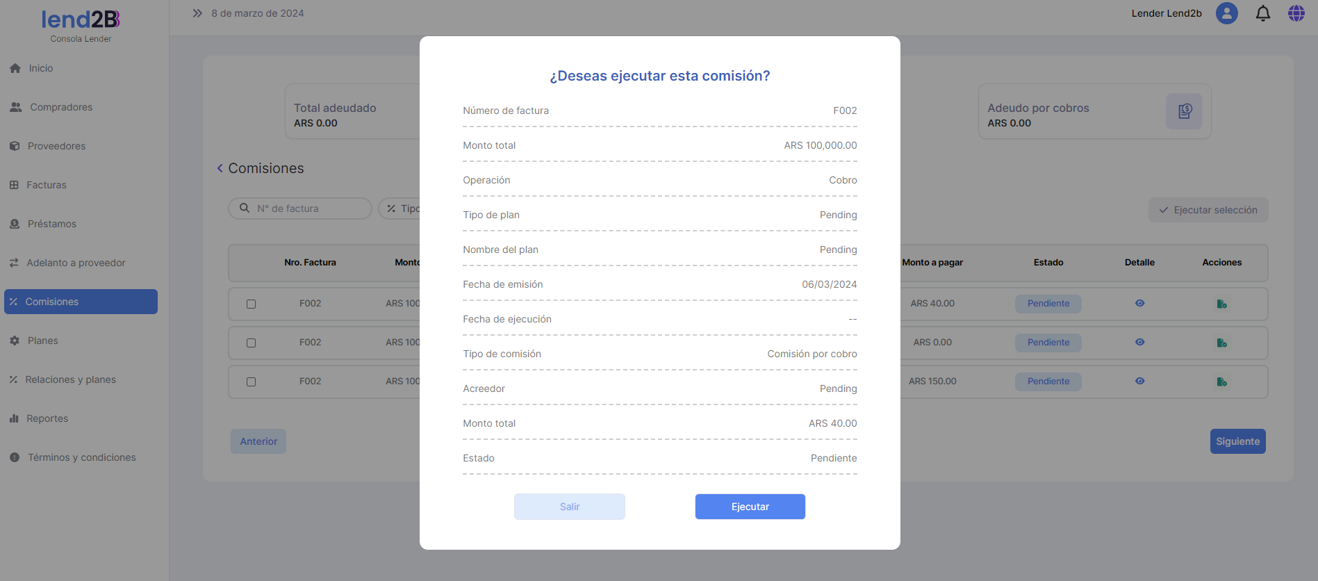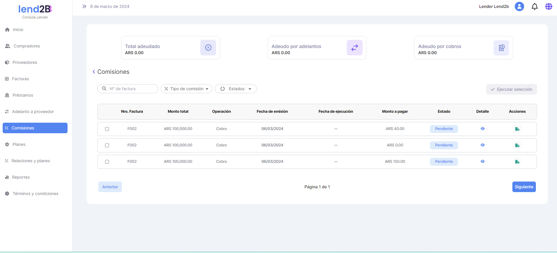 Calculo y presentación de comisiones y fees con montos y fecha de pago por parte del Lender