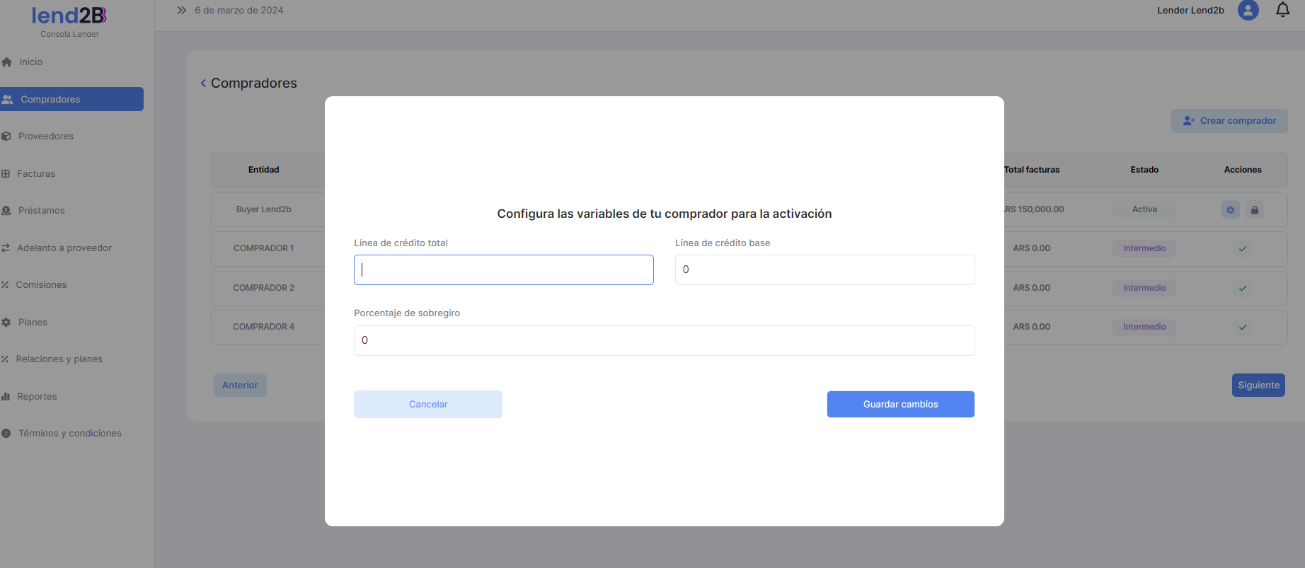 Al aceptar la activación se solicita cargar la Línea de crédito definida para el Comprador