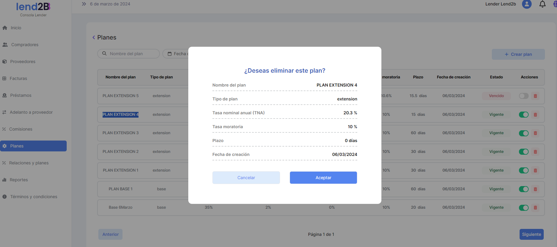 En el detalle de los Planes se puede cambiar de estado o eliminar un Plan