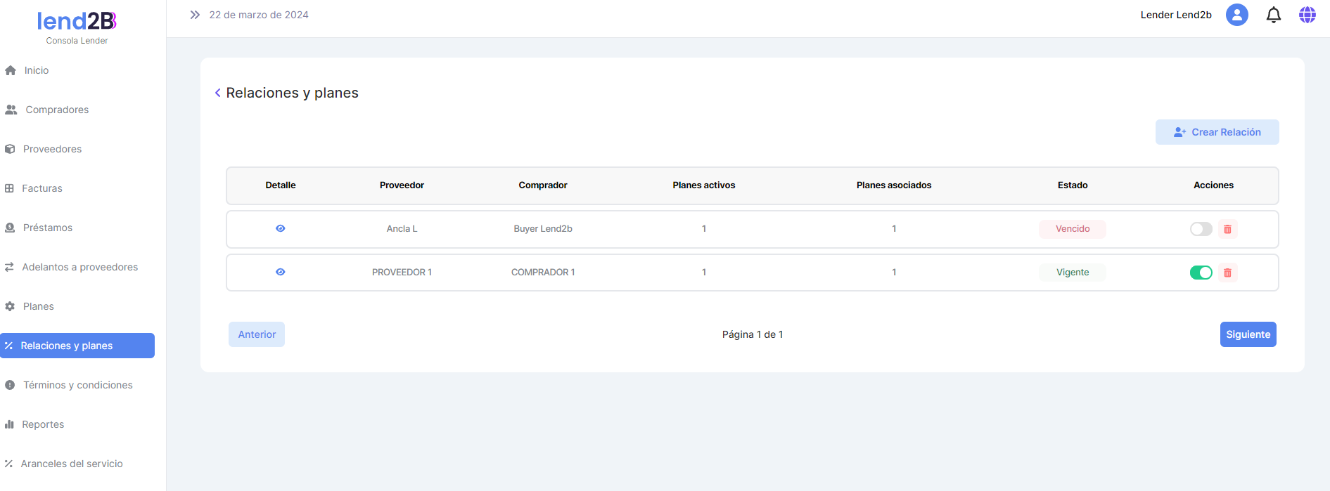 Se debe acceder a una pantalla similar a la de Relaciones y planes en la Consola del Lender