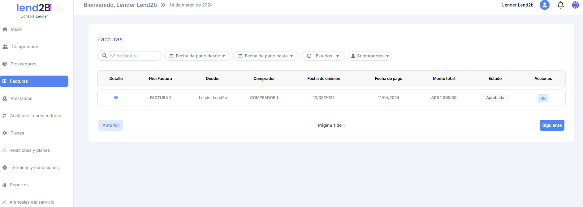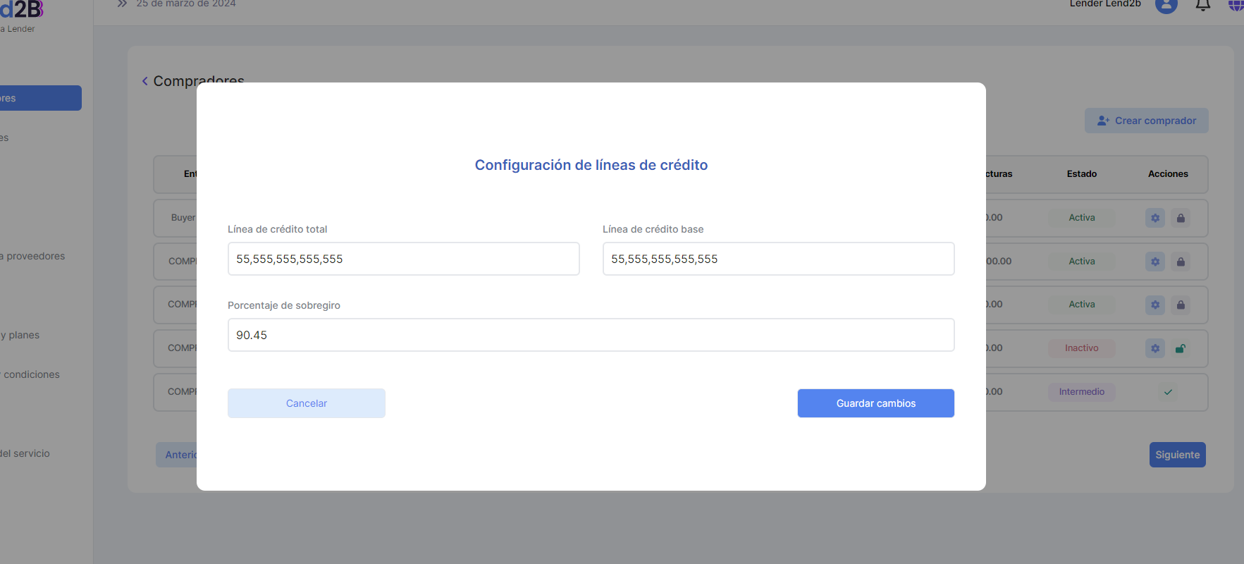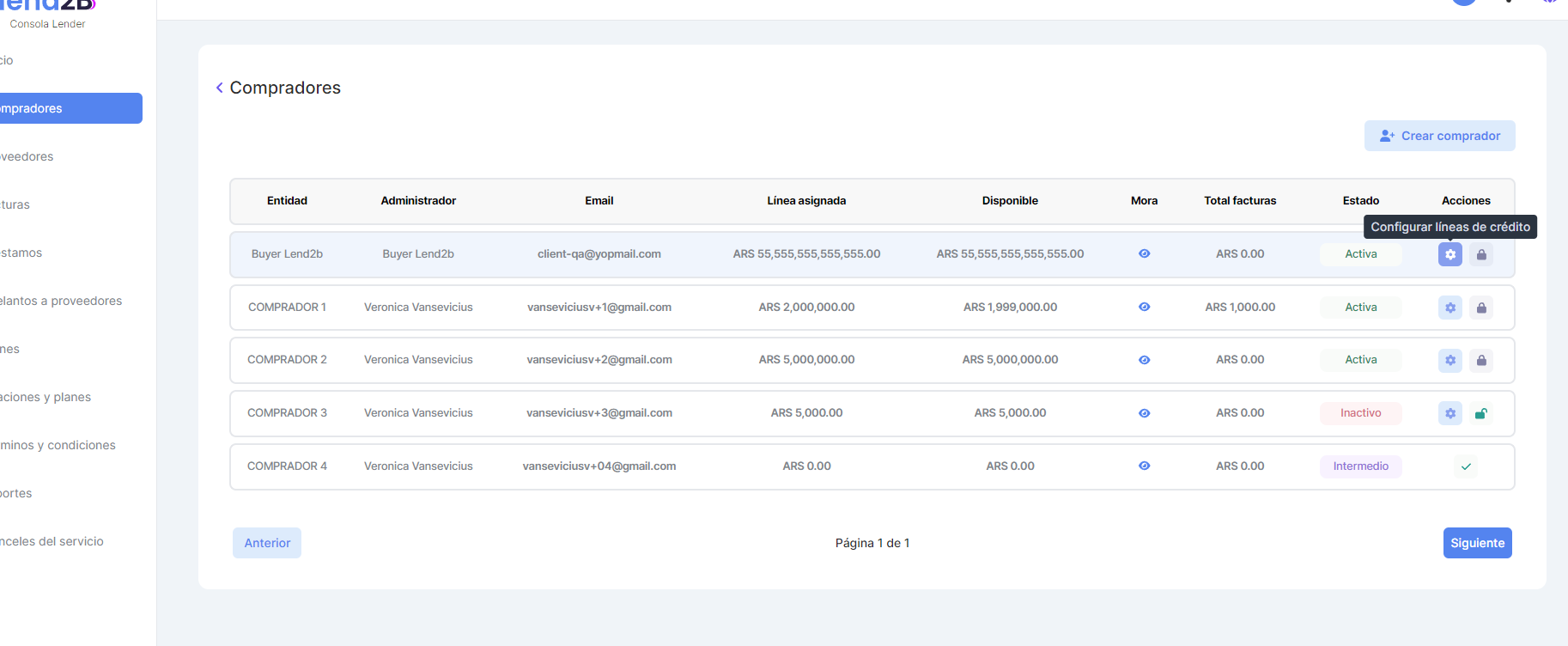 Se debe acceder a una pantalla similar a la de Compradores o Proveedores en la Consola del Lender